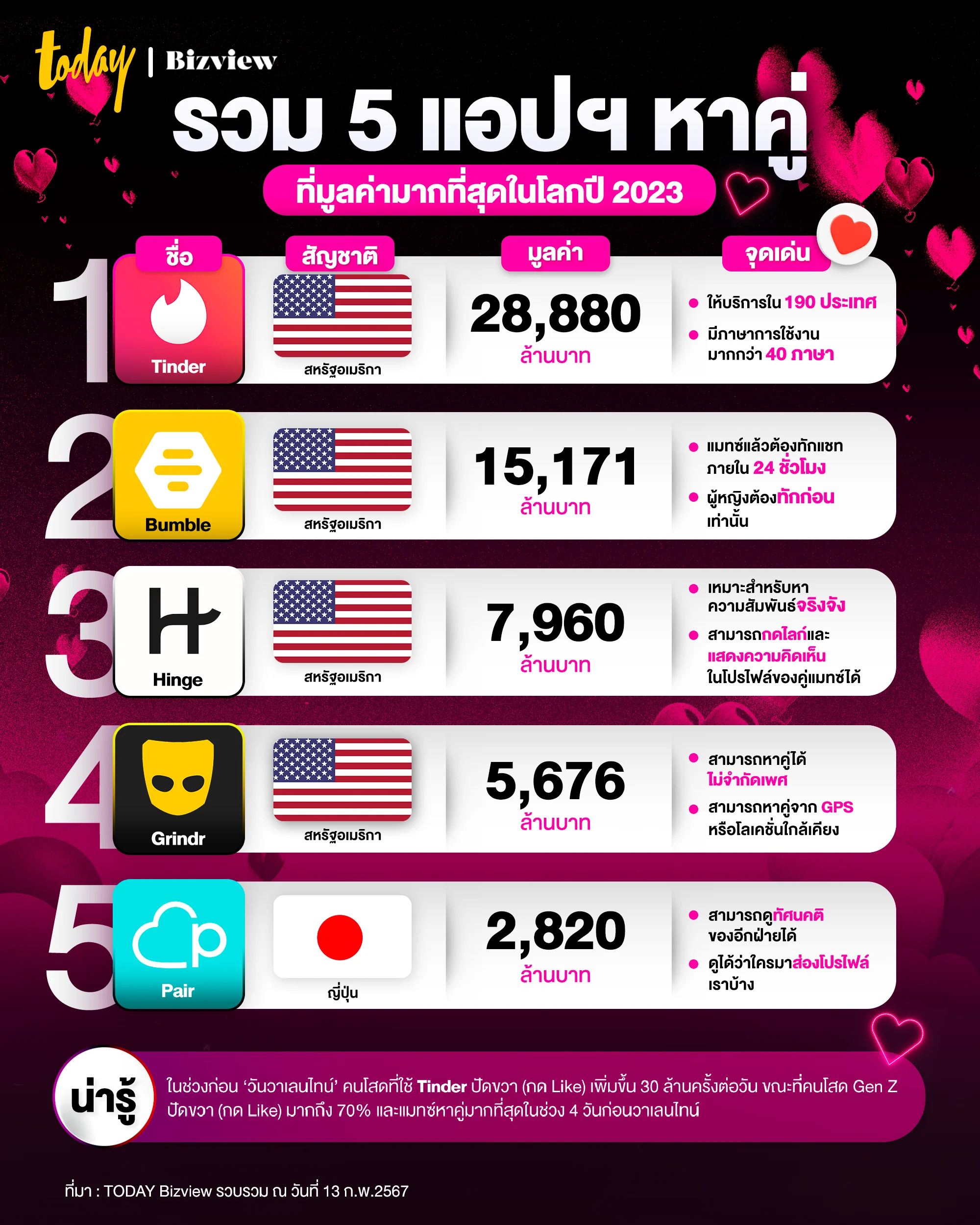 วันนี้ TODAY Bizview พาสำรวจแอปฯ หาคู่สุดฮอตฮิต ที่มีมูลค่ามากที่สุดในโลกในปี 2023 พร้อมนำเสนอฟีเจอร์เด่นสำหรับคนที่กำลังสนใจลองปัดสักแมทซ์รับวันวาเลนไทน์แบบนี้กันดู