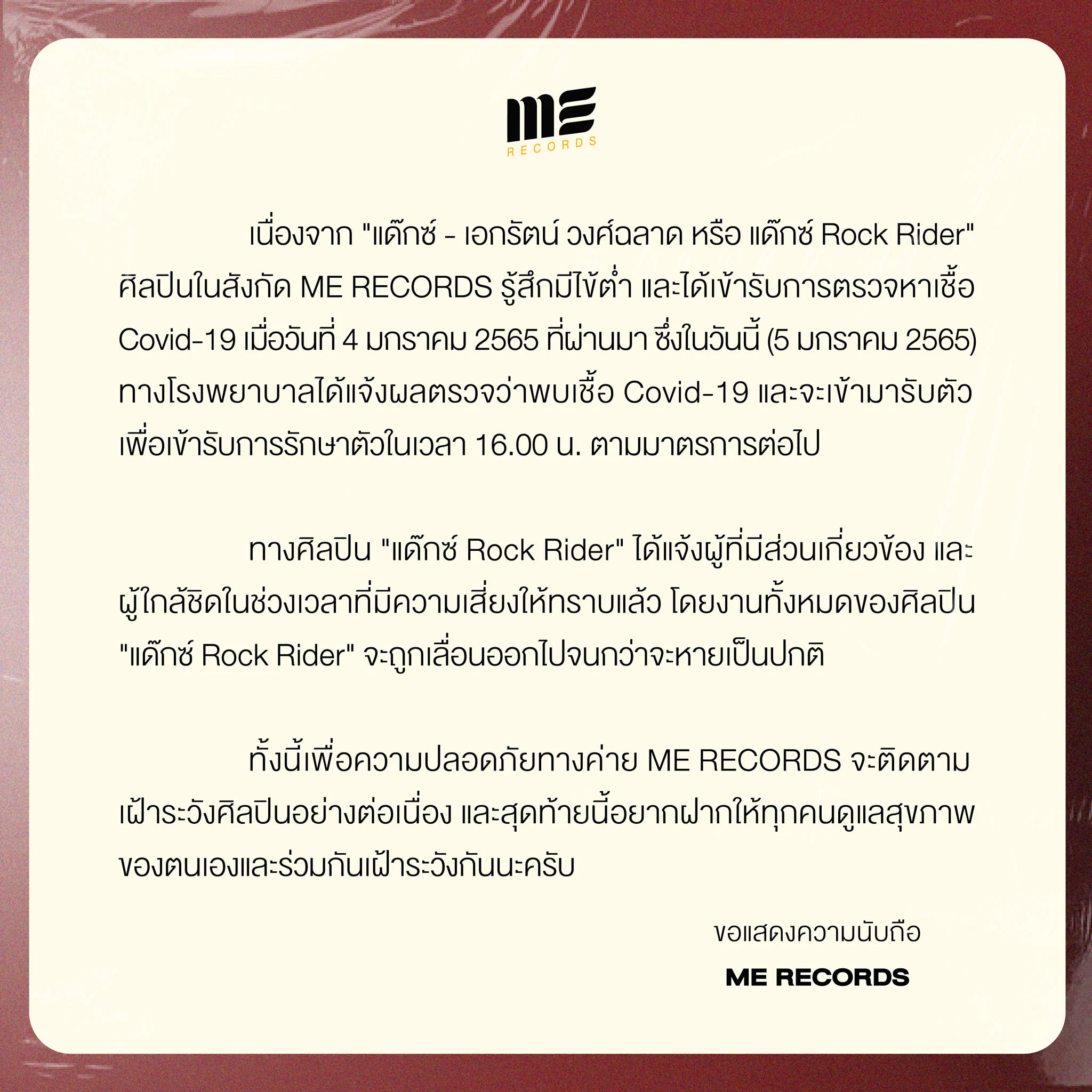 5 ม.ค. 65 : ‘ME RECORDS’ ต้นสังกัดของ ‘เอกรัตน์ วงศ์ฉลาด’ หรือ ‘แด๊กซ์ Rock Rider’ หลังเจ้าตัวได้ตรวจหาเชื้อ Covid-19 เมื่อวันที่ 4 ม.ค. 65 ที่ผ่านมา ซึ่งทางโรงพยาบาลได้แจ้งผลตรวจออกมาแล้วว่าพบเชื้อ และจะเข้ามารับตัวเพื่อเข้ารับการรักษาตัวตามมาตรการต่อไป