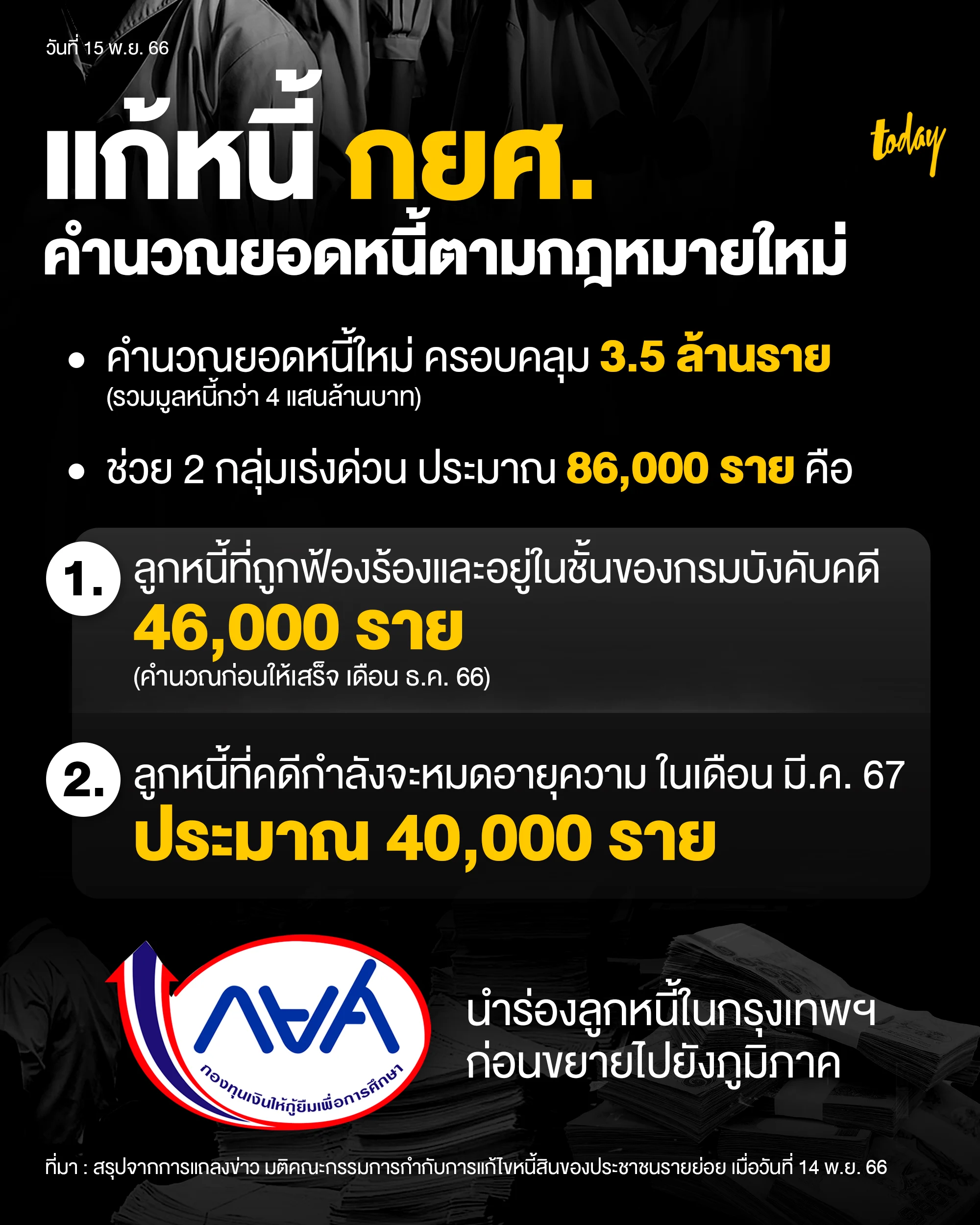 เมื่อเวลา 16.00 น. วันที่ 14 พ.ย. (ตามเวลาท้องถิ่นในนครซานฟรานซิสโก สหรัฐอเมริกา ซึ่งช้ากว่าประเทศไทย 15 ชั่วโมง) นายเศรษฐา ทวีสิน นายกรัฐมนตรีและรมว.คลัง กล่าวถึงกรณีที่ประชุมคณะกรรมการกำกับการแก้ไขหนี้สินของประชาชนรายย่อย เห็นชอบแนวทางแก้ปัญหาหนี้กองทุนเงินให้กู้ยืมเพื่อการศึกษา (กยศ.) ซึ่งจะคำนวณภาระหนี้ของลูกหนี้ที่ยังชำระไม่หมดให้กลับไปคำนวณเงินต้น และลูกหนี้ที่ชำระมากกว่า 150% สามารถหยุดจ่ายหนี้ได้ว่า