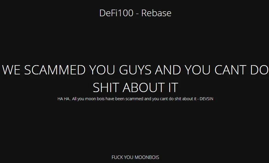 ล่าสุดสดๆ ร้อนๆ ที่เพิ่งเกิดขึ้นเมื่อช่วงสุดสัปดาห์ที่ผ่านมา คือกรณีโปรเจ็กต์ DeFi โปรเจ็กต์หนึ่งที่มีชื่อว่า DeFi100 ประกาศ exit scam หรือปิดโครงการทิ้ง พร้อมเชิดเงินนักลงทุนไป 32 ล้านดอลลาร์สหรัฐ หรือราว 1,000 ล้านบาท ทั้งยังทิ้งข้อความเอาไว้ซึ่งแปลอย่างสุภาพได้ว่า “เราโกงพวกคุณ และพวกคุณก็ทำอะไรไม่ได้หรอก”