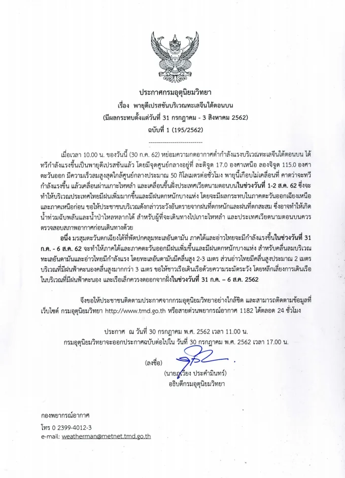 กรมอุตุนิยมวิทยา ประกาศเตือน ฉบับที่ 1 “พายุดีเปรสชันบริเวณทะเลจีนใต้ตอนบน มีผลกระทบตั้งแต่วันที่ 31 ก.ค.-3 ส.ค.62 ภาคเหนือและอีสาน ระวังอันตรายจากฝนที่ตกหนัก อาจทำให้เกิดน้ำท่วมฉับพลันและน้ำป่าไหลหลากได้
