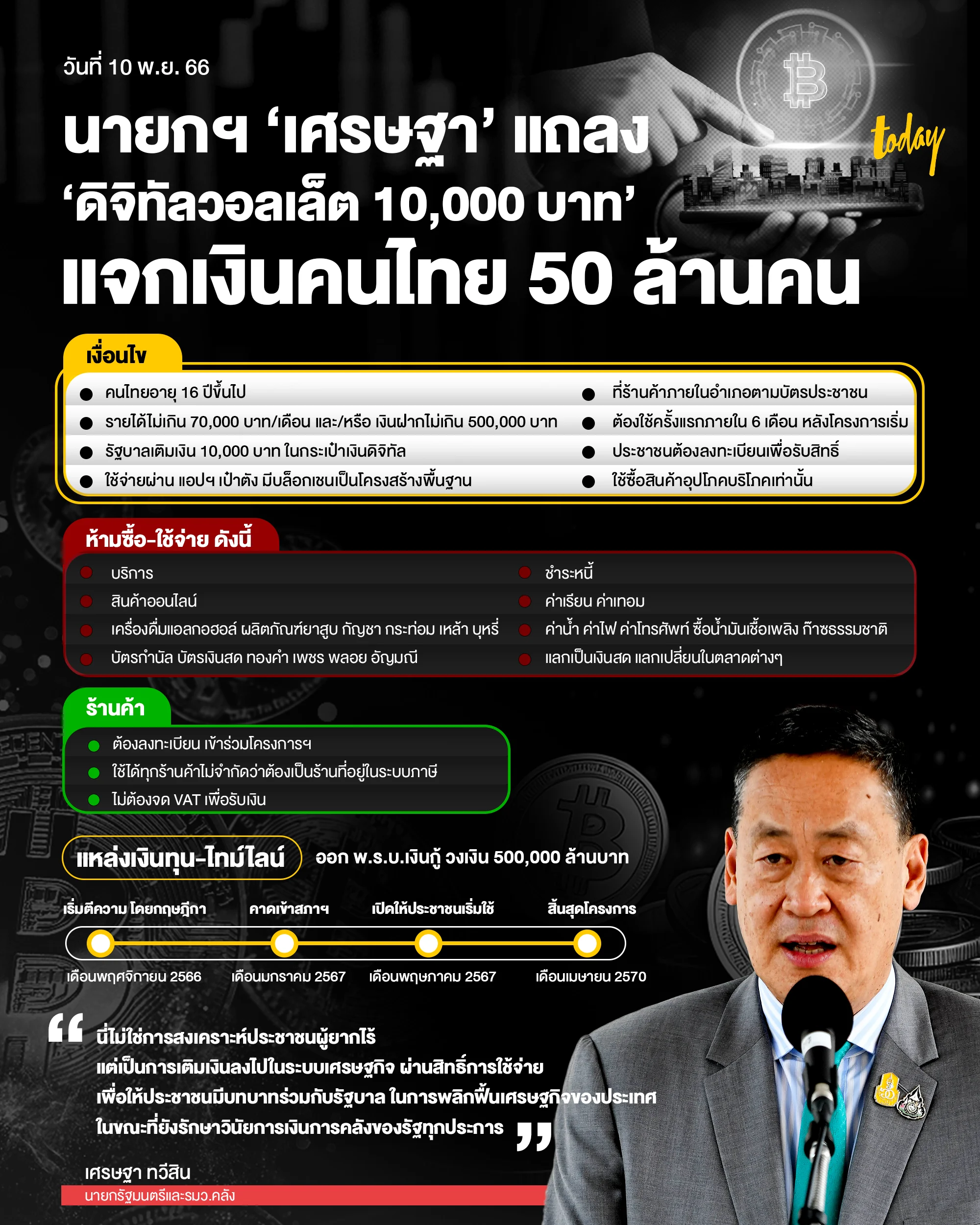 นายกฯ ‘เศรษฐา’ ตัดจบ ‘ดิจิทัลวอลเล็ต 10,000 บาท’ ให้ 50 ล้านคน กำหนดเงื่อนไข เงินเดือนไม่ถึง 70,000 บาท เงินฝากต่ำกว่า 500,000 บาท ต้องออก ‘พ.ร.บ.เงินกู้ 5 แสนล้านบาท’