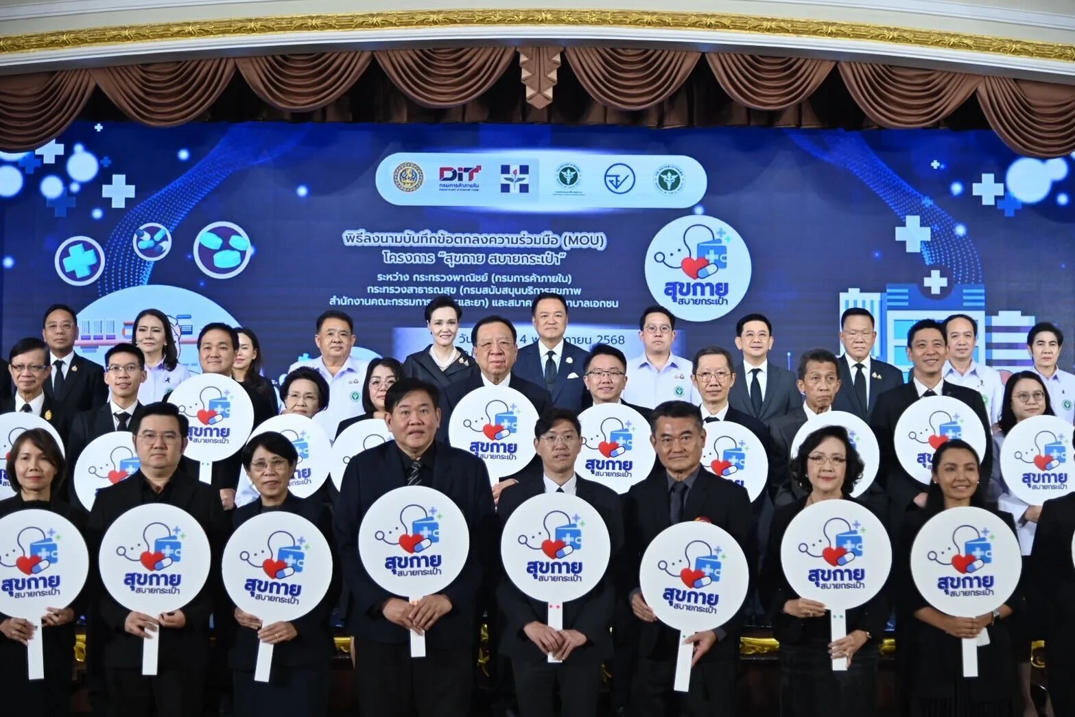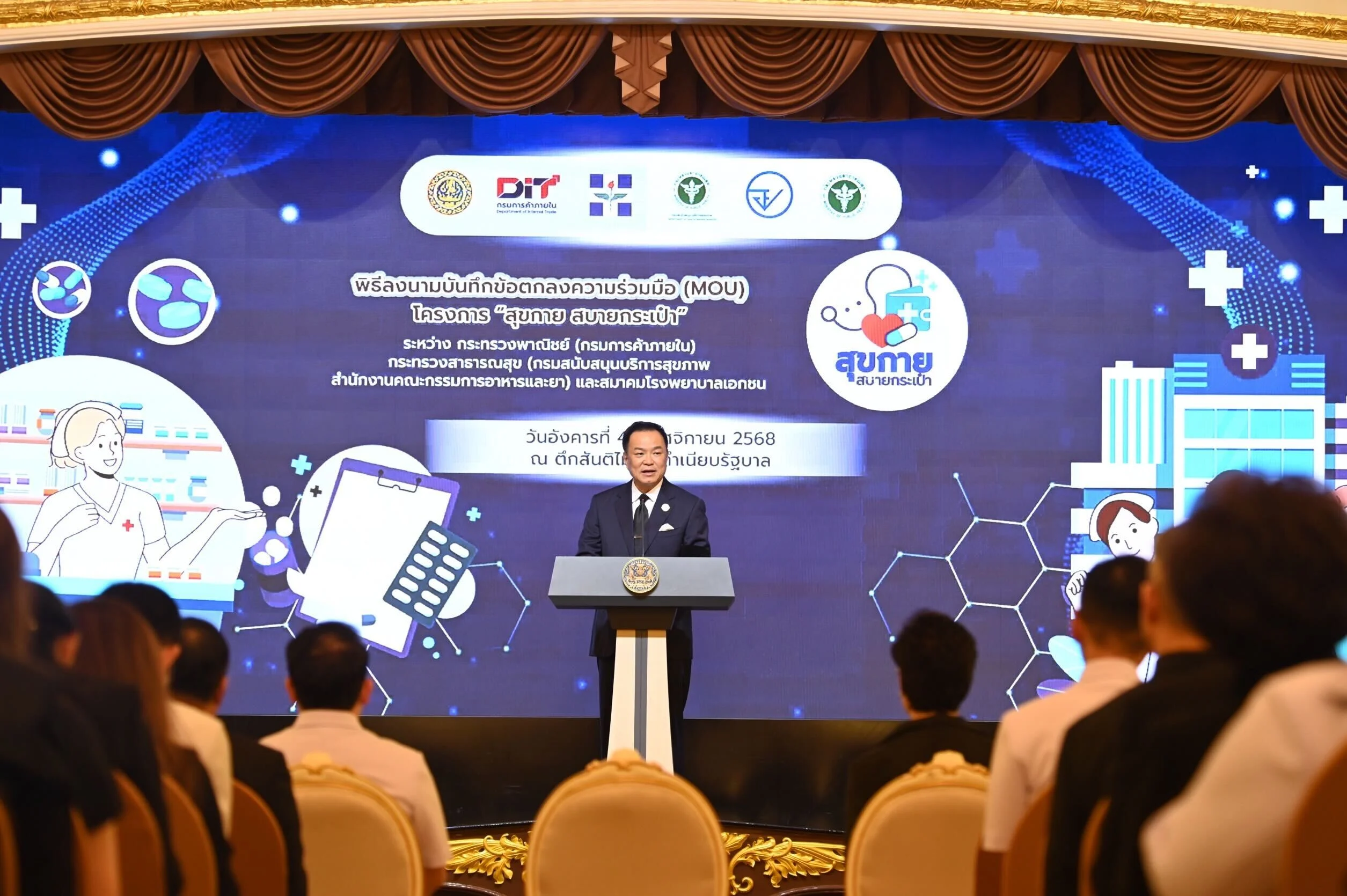 วันที่ 4 พฤศจิกายน 2568 กระทรวงพาณิชย์ (กรมการค้าภายใน) กระทรวงสาธารณสุข (กรมสนับสนุนบริการสุขภาพ และสำนักงานคณะกรรมการอาหารและยา) และสมาคมโรงพยาบาลเอกชน จับมือร่วมลงนามข้อตกลงความร่วมมือ (MOU) โครงการ “สุขกาย สบายกระเป๋า” โดยมีอนุทิน ชาญวีรกูล นายกรัฐมนตรีเป็นประธานแถลงข่าว พร้อมด้วยศุภจี สุธรรมพันธุ์ รัฐมนตรีว่าการกระทรวงพาณิชย์ และพัฒนา พร้อมพัฒน์ รัฐมนตรีว่าการกระทรวงสาธารณสุข ร่วมเป็นสักขีพยาน โดยมีเป้าหมายให้โรงพยาบาลเอกชนเปิดเผยค่ายา และเพิ่มทางเลือกให้ประชาชนสามารถเลือกซื้อยา ภายนอกโรงพยาบาลได้ ซึ่งจะทำให้ประชาชนมีทางเลือกในการใช้บริการโรงพยาบาลเอกชนเพิ่มมากขึ้น