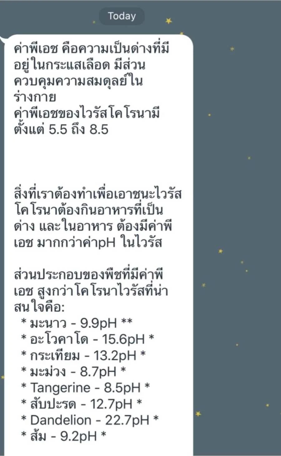จากกรณีข้อมูลที่มีการส่งต่อในโลกออนไลน์ ระบุค่า pH คือความเป็นด่างที่มีอยู่ในกระแสเลือดมีส่วนควบคุมความสมดุลในร่างกาย โดยค่า pH ของไวรัสโควิด-19 มีตั้งแต่ 5.5 ถึง 8.5 สิ่งที่เราต้องทำเพื่อเอาชนะไวรัสโควิด-19 คือต้องกินอาหารที่เป็นด่าง และในอาหารจะต้องมีค่า pH มากกว่าค่า pH ในไวรัส โดยส่วนประกอบของพืชที่มีค่า pH สูงกว่าโคโรนาไวรัสที่น่าสนใจ เช่นมะนาว 9.9 pH อะโวคาโด 15.6 pH กระเทียม 13.2 pH มะม่วง 8.7 pH ส้ม 9.2 pH เป็นต้น