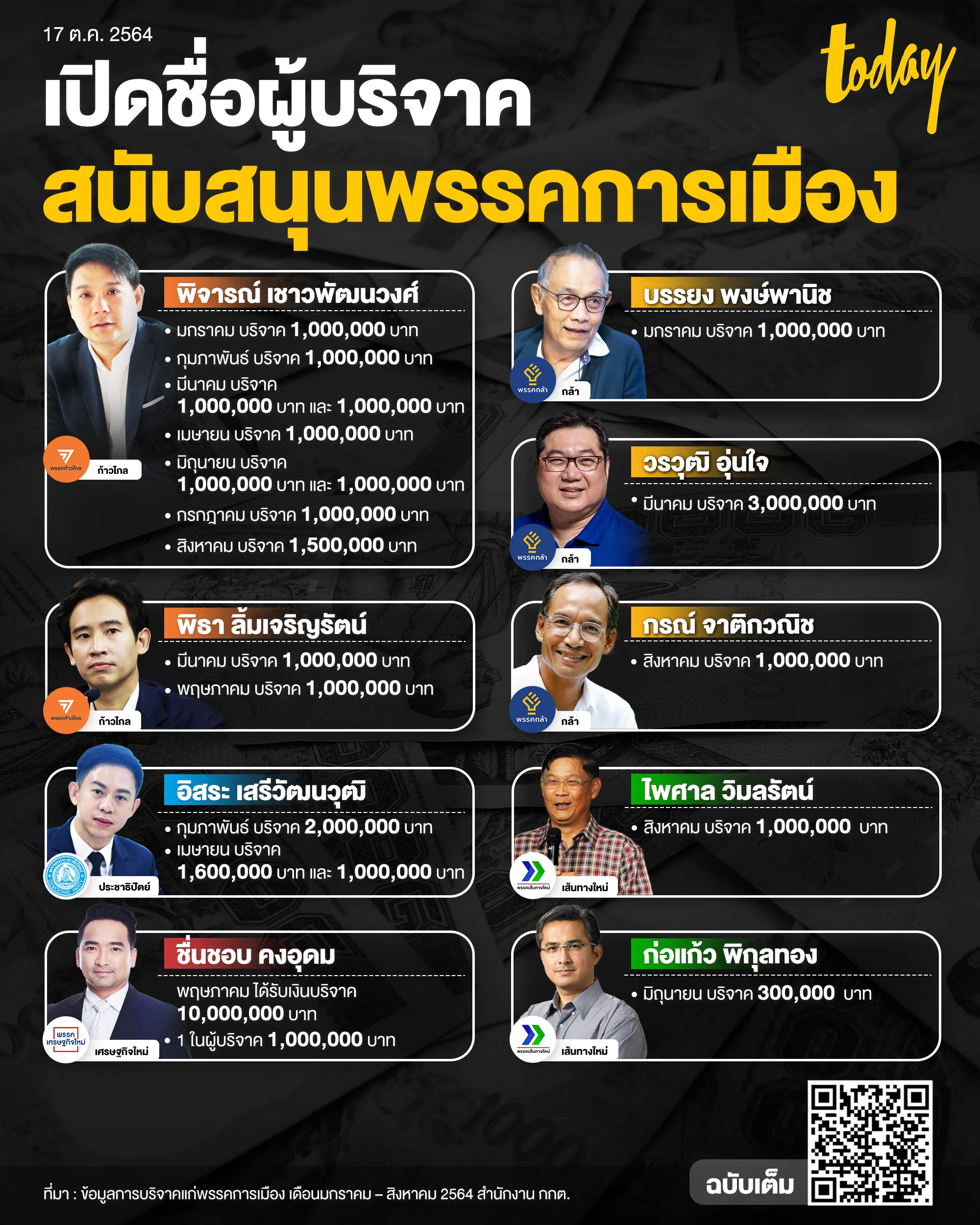 เพิ่มเติมจากกราฟิกข้างต้น ยังมี ‘พรรคพลังประชารัฐ’ แกนนำรัฐบาลปัจจุบัน มีชื่อผู้บริจาคในเดือนพฤษภาคม คือ สิทธิกร ประภาจรัสวงศ์ บริจาค 3,000,000 บาท, ชัยณัฐร์ กรณ์ชายานันท์ 3,000,000 บาท