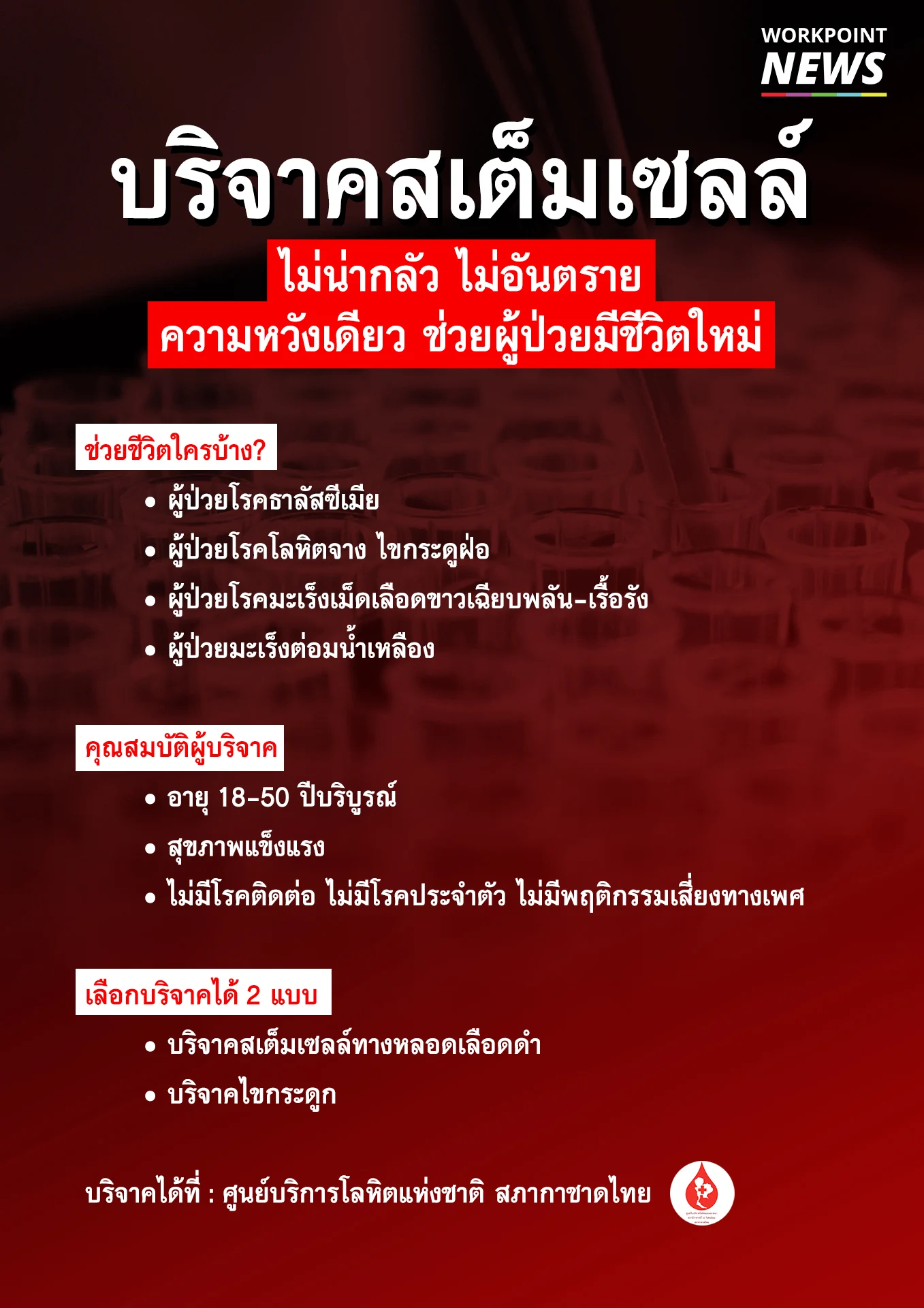 ทราบหรือไม่ว่า ที่จริงแล้ว “การบริจาคสเต็มเซลล์” ไม่น่ากลัว และไม่เป็นอันตรายต่อผู้บริจาคเลย ทั้งยังได้ทำบุญครั้งใหญ่ เสมือนต่อชีวิตให้ผู้ป่วยได้เกิดใหม่ เนื่องจากการบริจาคสเต็มเซลล์เป็นความหวังเดียว ที่จะรักษาผู้ป่วยโรคทางโลหิตให้หายขาดได้ในปัจจุบัน ซึ่งโรคที่สามารถรักษาได้ด้วยการปลูกถ่ายสเต็มเซลล์ เช่น โรคโลหิตจางธาลัสซีเมีย, โรคโลหิตจางชนิดไขกระดูกฝ่อ, โรคมะเร็งเม็ดโลหิตขาวเฉียบพลัน / เรื้อรัง, โรคมะเร็งต่อมน้ำเหลือง เป็นต้น