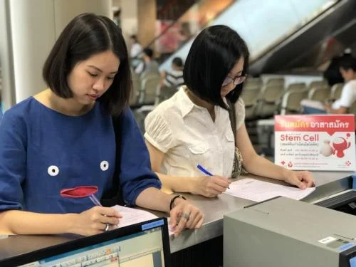 เมื่อตรวจสอบคุณสมบัติครบถ้วนแล้ว ก็เดินทางไปบริจาคสเต็มเซลล์ได้ที่ ศูนย์บริการโลหิตแห่งชาติ สภากาชาดไทย โดยเริ่มจากการลงทะเบียนเป็นอาสาสมัครบริจาคสเต็มเซลล์ หลังจากผ่านขั้นตอนการลงทะเบียนบริจาคโลหิต, ตรวจความเข้มข้นโลหิต, ตรวจวัดความดันโลหิตแล้ว ให้ติดต่อเคาน์เตอร์ประชาสัมพันธ์ ก่อนไปบริจาคโลหิต ชั้น 2