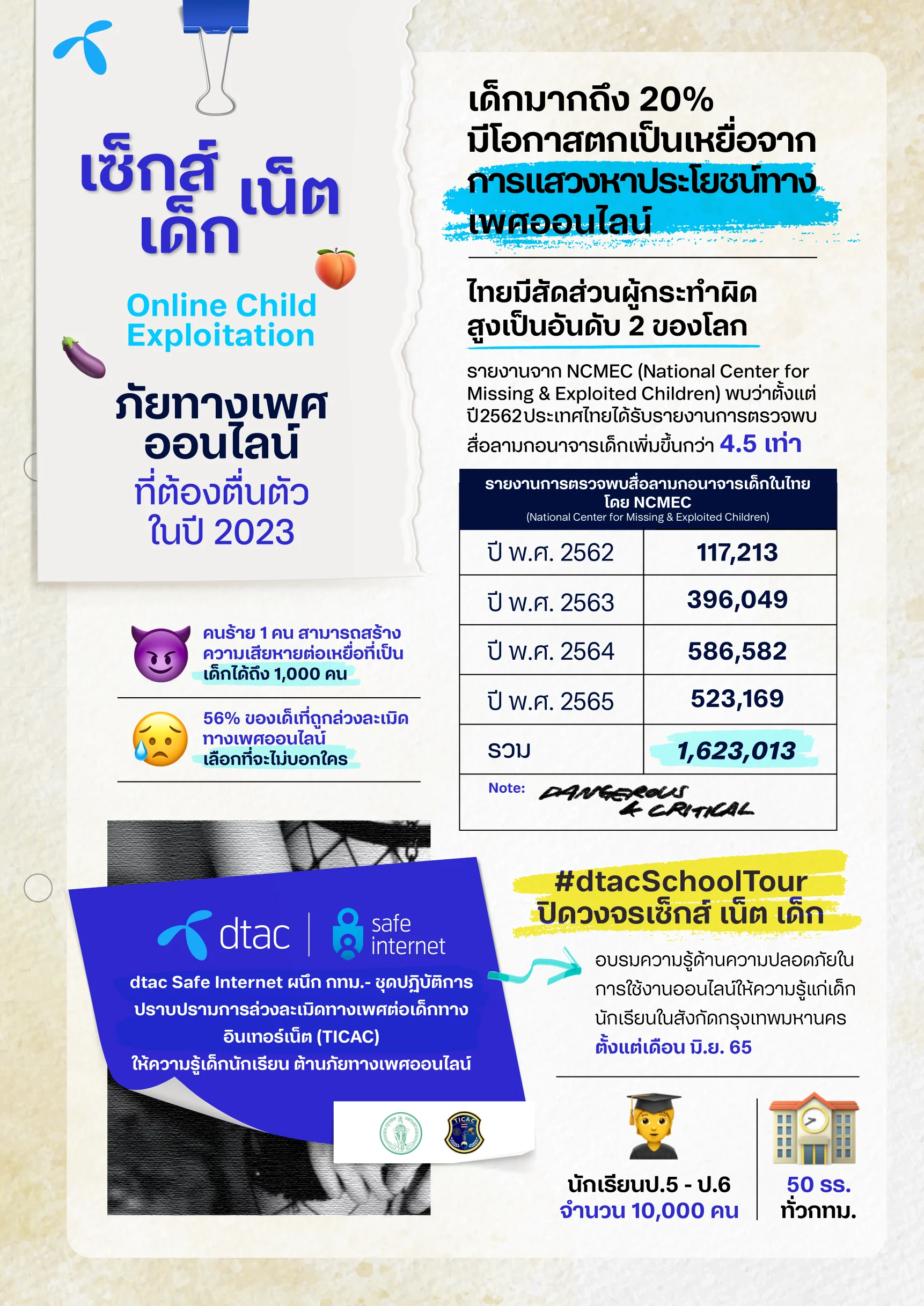 ดีแทค ผนึกกำลัง กรุงเทพมหานคร และกลุ่มงานต่อต้านการล่วงละเมิดทางเพศต่อเด็กทางอินเทอร์เน็ต ตำรวจไซเบอร์ (TICAC-CCIB) ออนทัวร์ให้ความรู้เด็กนักเรียนสังกัด กทม. หลังพบข้อมูลชี้เด็กไทยเสี่ยงตกเป็นเหยื่อจากการแสวงหาประโยชน์ทางเพศออนไลน์ (Online Child Exploitation) สูงถึง 20% สัดส่วนผู้กระทำผิดสูงเป็นอันดับ 2 ของโลก ความเหลื่อมล้ำซัดเด็กแพร่ภาพของตัวเองแลกเงิน พร้อมกันนี้ ดีแทคได้ตั้งเป้าพัฒนาความรู้ครอบคลุมนักเรียนประถมปลายทั่วประเทศภายใต้โครงการ dtac Safe Internet