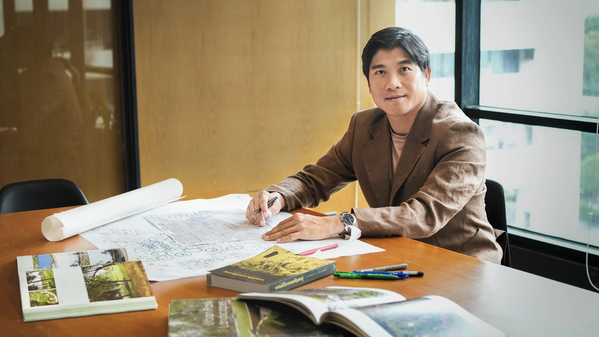 นอกจากนี้ การดีไซน์พื้นที่ยังได้คำนึงถึงมาตรฐานการรับรอง LEED ซึ่งเป็นมาตรฐานของอาคารสีเขียว โดยการใช้วัสดุธรรมชาติที่ทดแทนได้ อาทิ การสร้างทางเดินลาดด้วยไม้ที่เป็นวัสดุธรรมชาติที่มีความทนทานและสามารถทดแทนได้ และยังสร้างประสบการณ์ให้ผู้ใช้รู้สึกอบอุ่นเหมือนได้สัมผัสธรรมชาติจริง ๆ การใช้หินในบางพื้นที่ และใช้วัสดุทดแทน อย่างกรวดและทรายขัดล้างแทนที่ซีเมนต์เบส เพื่อให้ได้สีสันความสวยงามตามธรรมชาติและทำให้พื้นผิวมีความน่าสนใจ และอีกหนึ่งสิ่งที่สำคัญ คือ งานโครงสร้าง โดยเราได้ร่วมทำงานกับ Structure Engineer ที่ได้ออกแบบและวางรูปแบบโครงสร้างที่มีความซับซ้อนสูง เพื่อรองรับแพลตฟอร์มของอาคารทั้ง 4 องค์ประกอบ ทั้งโรงแรม ที่พักอาศัย ศูนย์การค้า และสำนักงาน ที่มีลักษณะและรูปแบบที่แตกต่างกัน เรามีการขึ้นโครงสร้างและคานของสวนในทุกขั้นตอนในเชิงสามมิติ ครบทุกโซน ทุกรายละเอียด เพื่อให้ง่ายต่อการ Joint ทุกชิ้นส่วนเข้าด้วยกัน สร้างความแข็งแรงให้โครงสร้างสามารถรองรับน้ำหนักได้มากและไม่รั่วซึม ทำให้พื้นที่ด้านบนสามารถรองรับได้ทั้งต้นไม้ขนาดใหญ่ น้ำตก และพื้นที่กิจกรรมต่างๆ”