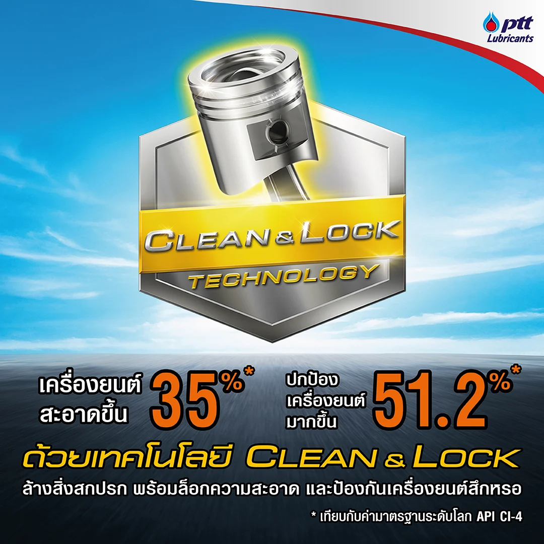 โดยจากผลการทดสอบทางวิทยาศาสตร์พบว่า เทคโนโลยี CLEAN AND LOCK สามารถทำให้เครื่องยนต์สะอาดได้มากขึ้นถึง 35% เมื่อทดสอบด้วย “Top Land Heavy Carbon of Caterpillar 1P และ “Weight Demerit of Caterpillar C-13” ตามมาตรฐาน API CJ-4 และเมื่อทดสอบด้วย “Cylinder Liner Wear of MACK T-10” พบว่าช่วยลดโอกาสการสึกหรอของเครื่องยนต์ได้ถึง 51.2% ซึ่งสูงกว่ามาตรฐาน API CI-4 ทำให้เครื่องยนต์ทำงานได้เต็มสมรรถนะ ไม่อืด ตอบสนองอัตราเร่งได้ดีตลอดอายุการเปลี่ยนถ่าย เหมาะกับทั้งการใช้งานรถอย่างหนักในเชิงพาณิชย์และการใช้งานส่วนตัวทั่วไป หรือไม่ว่าจะใช้รถแบบไหนก็ตอบโจทย์