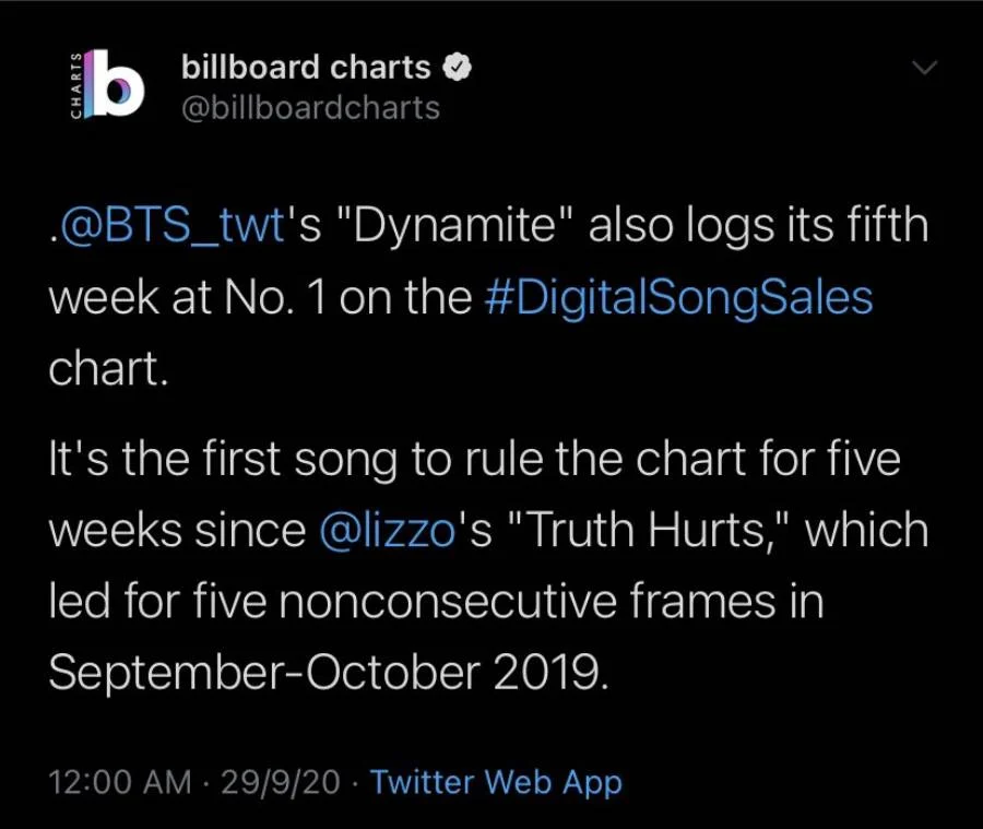 วันที่ 29 ก.ย. 2563 Billboard ได้ประกาศการกลับขึ้นอันดับ 1 ในชาร์ต Billboard HOT 100 อีกครั้งของเพลง Dynamite ในสัปดาห์นี้โดยชาร์ตเพลงสิ้นสุดวันที่ 3 ต.ค. 2563