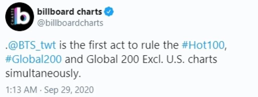 BTS ส่งเพลง Dynamite กลับขึ้นอันดับ 1 Billboard HOT 100 รวม 3 สัปดาห์ ขณะที่ยังติดอันดับ 1 อีกหลายชาร์ตของ Billboard ทั้ง Digital Song Sales chart 5 สัปดาห์ซ้อน, Global Excl. U.S. 2 สัปดาห์ซ้อน และ Global 200 ในสัปดาห์แรก