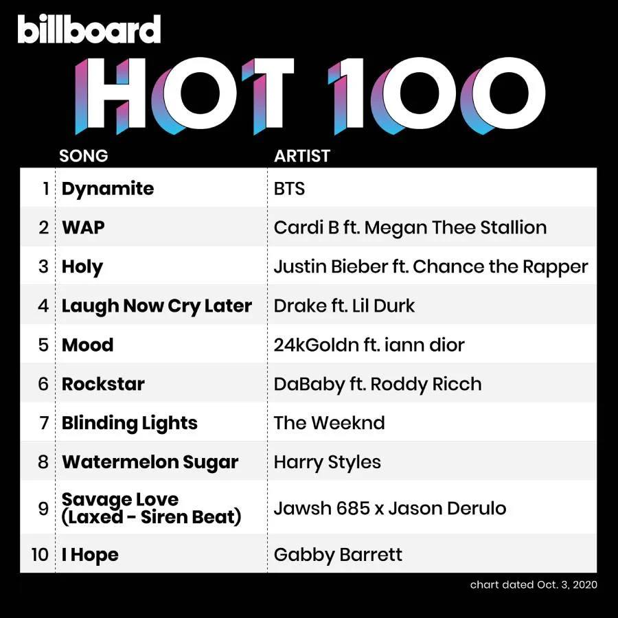 ก่อนหน้านี้ BTS กลายเป็นศิลปินเกาหลีใต้วงแรกที่สามารถขึ้นสู่อันดับ 1 บนชาร์ต Billboard HOT 100 ด้วยเพลง Dynamite ติดต่อกัน 2 สัปดาห์ ก่อนที่จะตกลงมาอยู่ในอันดับที่ 2 ติดต่อกันอีก 2 สัปดาห์ ก่อนจะกลับสู่อันดับ 1 อีกครั้งในสัปดาห์นี้ ซึ่งขณะนี้สถิติอันดับ 1 ของ BTS รวมกันเป็นทั้งหมด 3 สัปดาห์ด้วยกัน