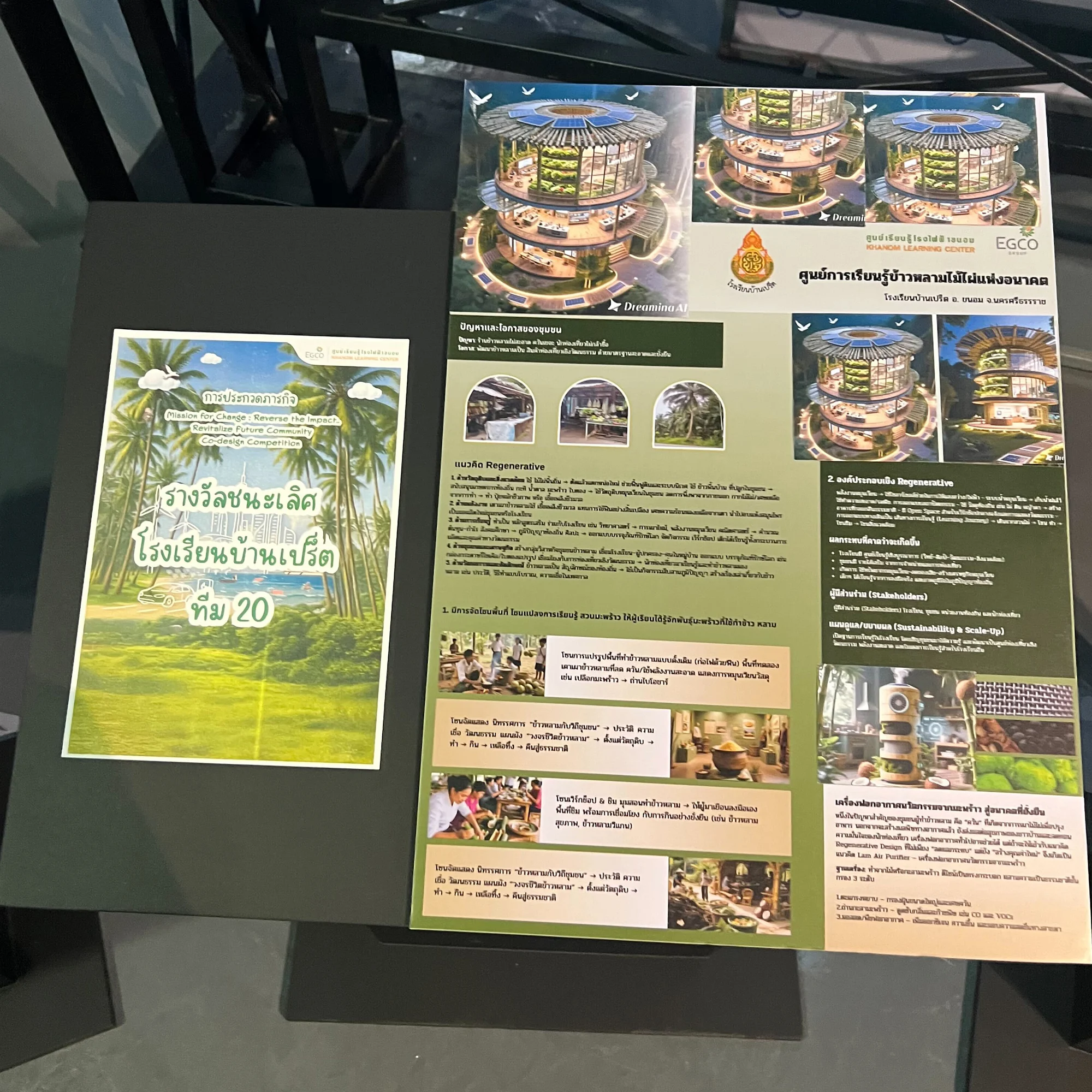 แนวคิด “Triple R” ได้รับการสานต่ออย่างเป็นรูปธรรม ในโครงการประกวดออกแบบ “Mission for Change” ซึ่งเปิดพื้นที่ให้เยาวชนในอำเภอขนอมได้ร่วมแชร์ไอเดียพลิกฟื้นโรงเรียนและชุมชนของตนเอง และมีพี่ ๆ นักศึกษาจากมหาวิทยาลัยวลัยลักษณ์ใช้ AI มาช่วยออกแบบผลงานให้เห็นภาพที่ชัดเจนและเป็นรูปธรรม โดยศูนย์เรียนรู้ฯ ได้นำผลงานจากผู้เข้าประกวดกว่า 30 ทีมและผลงานของ 7 ทีมที่ได้รับรางวัล มาจัดแสดงในนิทรรศการนี้ด้วย ทั้งหมดนี้คือเมล็ดพันธุ์สำคัญที่จะเติบโตเป็น “Re-Gen Hero” เพื่อพลิกฟื้นและคืนสมดุลท้องถิ่นให้ดีขึ้นยิ่งกว่าเดิม