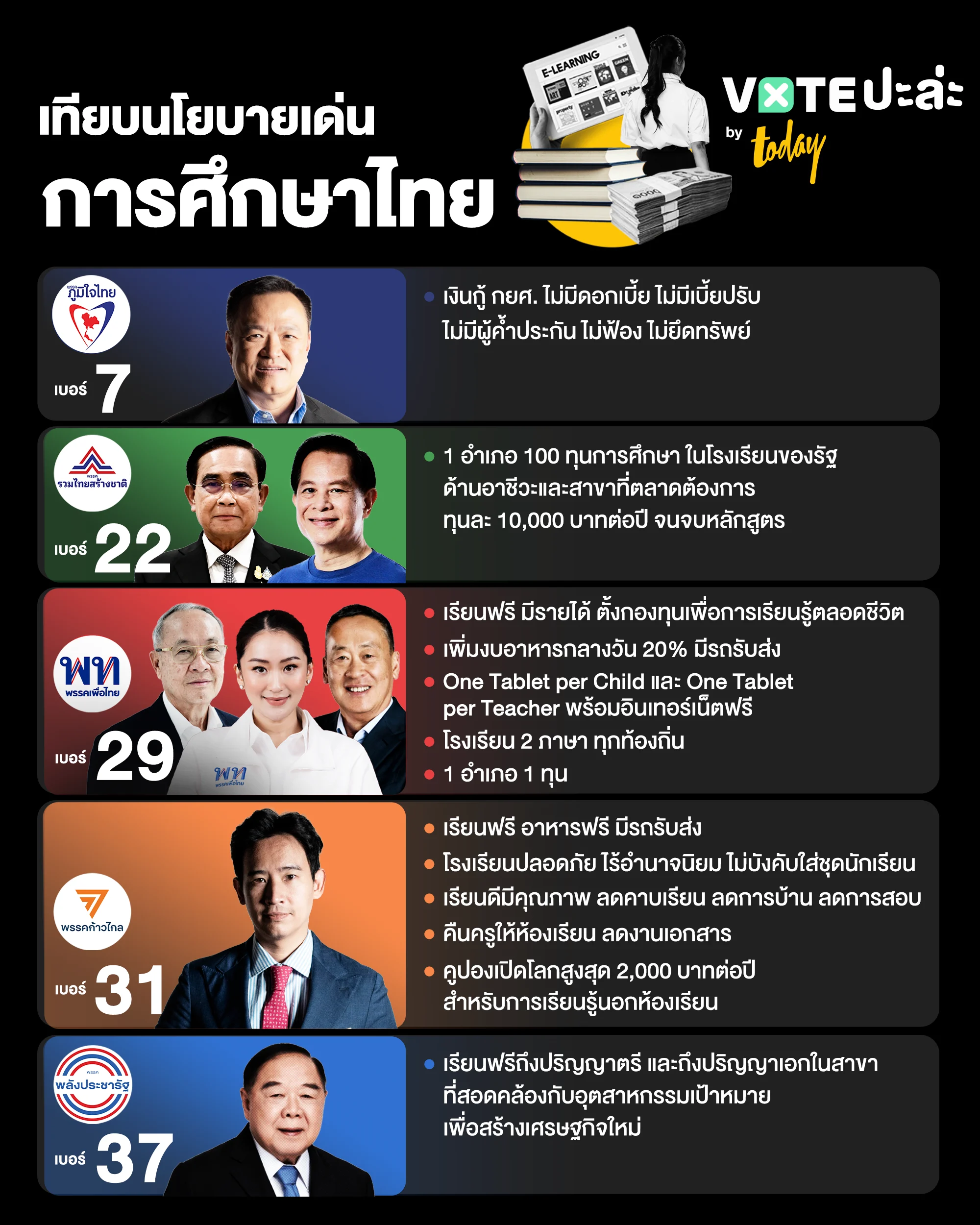สำนักข่าว TODAY รวบรวมนโยบายเด่น ด้านการศึกษา จากพรรคการเมือง 5 พรรค ได้แก่ ภูมิใจไทย รวมไทยสร้างชาติ เพื่อไทย ก้าวไกล และ พลังประชารัฐ ในการเลือกตั้ง 2566 นี้