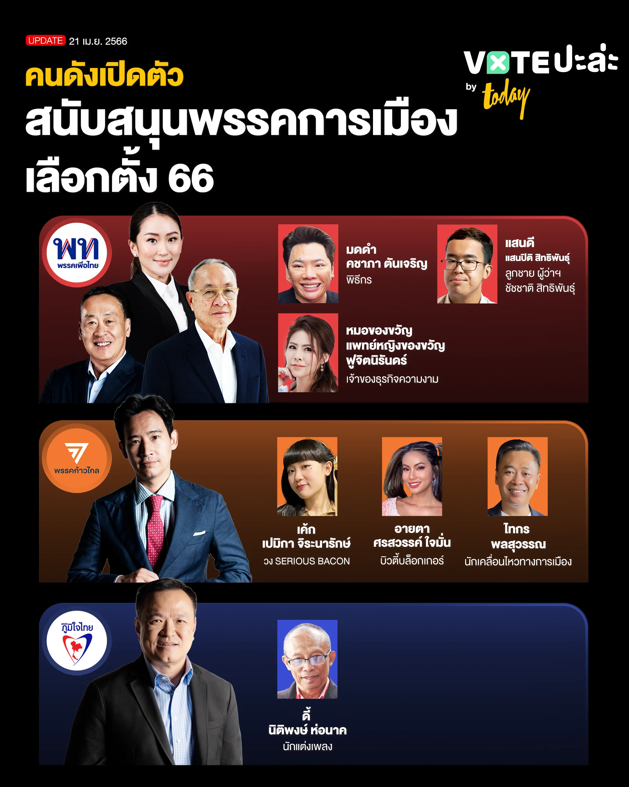 ขยับเข้าใกล้ช่วงเวลาหาเสียงโค้งสุดท้าย พรรคการเมือง ผู้สมัคร ลงพื้นที่ ขึ้นเวทีดีเบต ขอคะแนนอย่างต่อเนื่อง สำนักข่าว TODAY รวบรวม ‘คนดัง’ บุคคลที่มีชื่อเสียง เป็นที่รู้จักของผู้คน ในการเลือกตั้ง 2566 เขาเชียร์ใคร พรรคไหนกันบ้าง