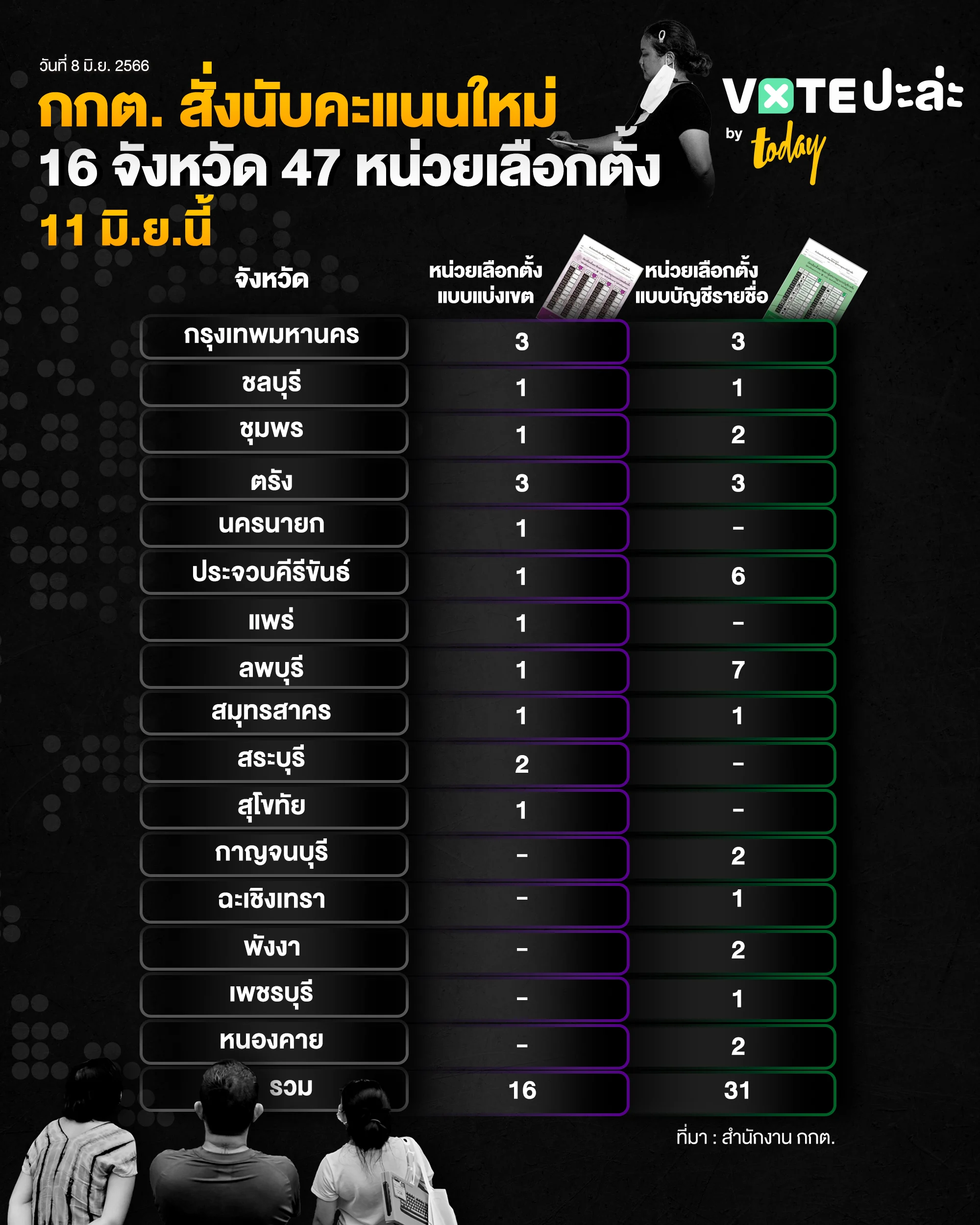 กกต. มีคำสั่ง ให้นับคะแนนเลือกตั้ง ส.ส. ใหม่ 47 หน่วยเลือกตั้ง ใน 16 จังหวัด เนื่องจากการนับคะแนนไม่ถูกต้อง ในวันที่ 11 มิ.ย.นี้