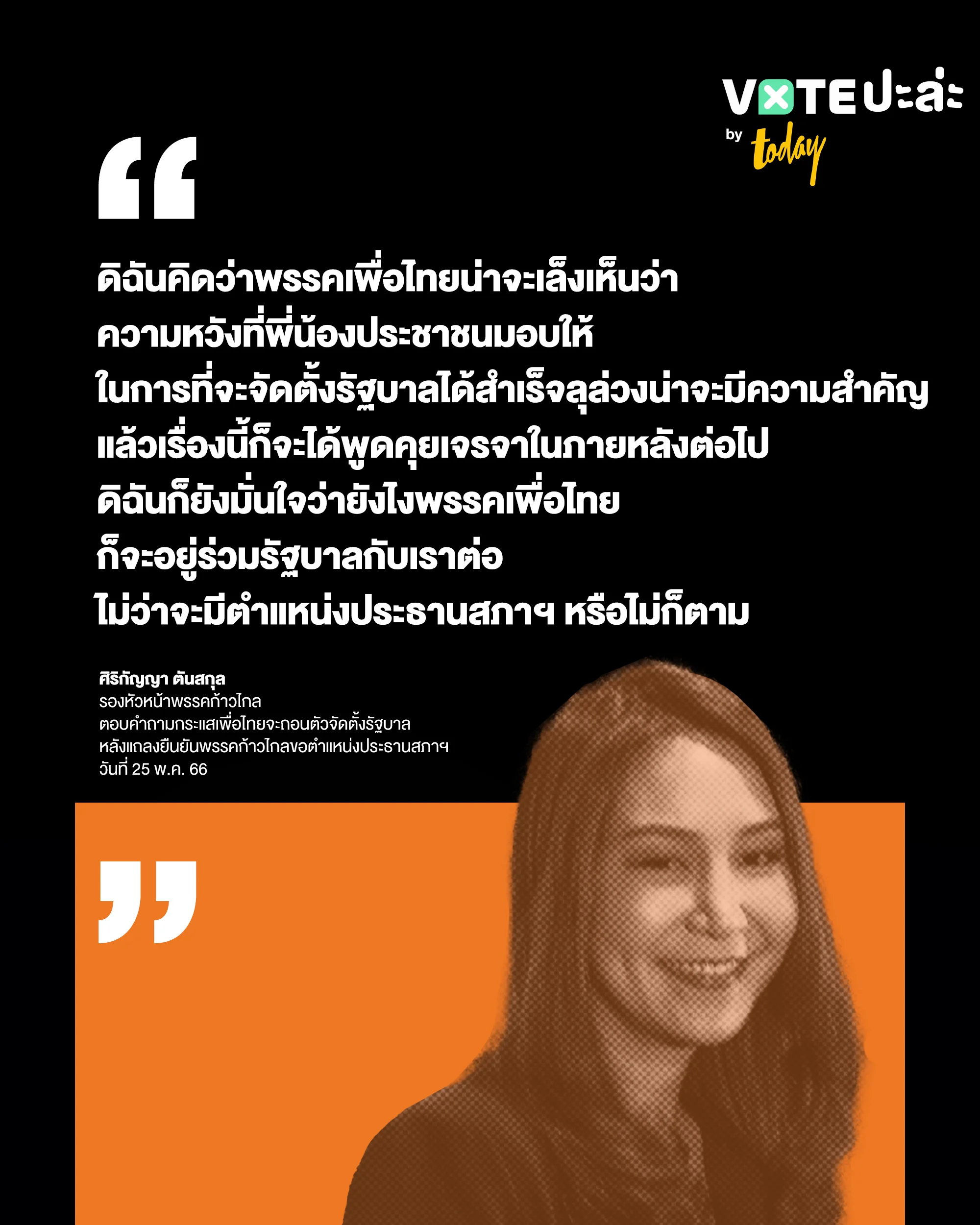 “ดิฉันคิดว่าพรรคเพื่อไทยน่าจะเล็งเห็นว่าความหวังที่พี่น้องประชาชนมอบให้ในการที่จะจัดตั้งรัฐบาลได้สำเร็จลุล่วงน่าจะมีความสำคัญ แล้วเรื่องนี้ก็จะได้พูดคุยเจรจาในภายหลังต่อไป ดิฉันก็ยังมั่นใจว่ายังไงพรรคเพื่อไทย ก็จะอยู่ร่วมรัฐบาลกับเราต่อไม่ว่าจะมีตำแหน่งประธานสภาฯ หรือไม่ก็ตาม”