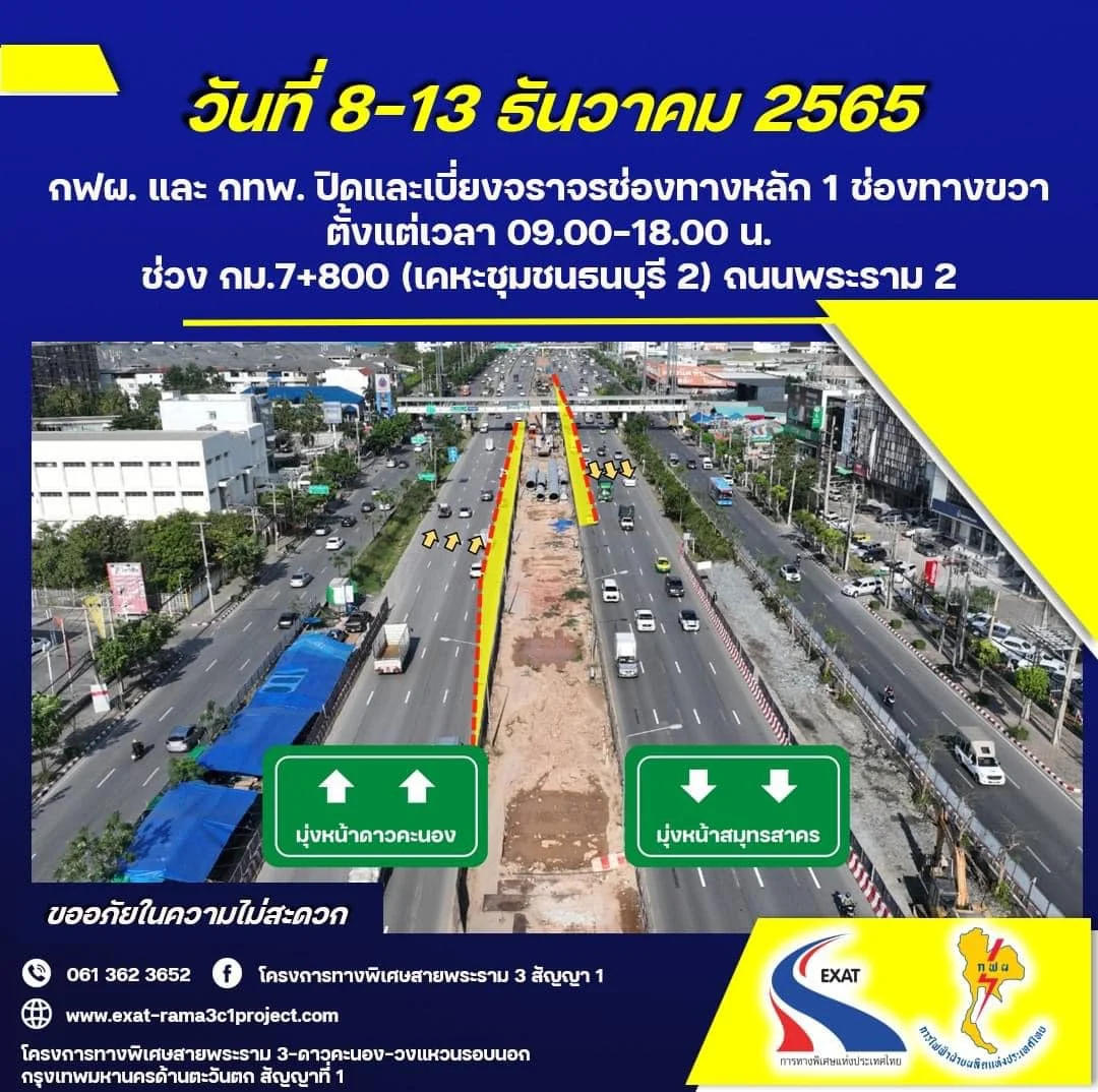 เตือนผู้ใช้ถนนพระราม 2 ช่วงนี้เลี่ยงได้เลี่ยงไปก่อน เพราะจะมีการปิดถนนเพื่อตั้งเสาส่งไฟฟ้าแรงสูงระหว่างวันที่ 7-13 ธ.ค.นี้ จะปิดช่องทางจราจรขาเข้ากรุงเทพฯ ขวาสุด 1 ช่องทาง ตั้งแต่ 09.00 – 18.00 น.