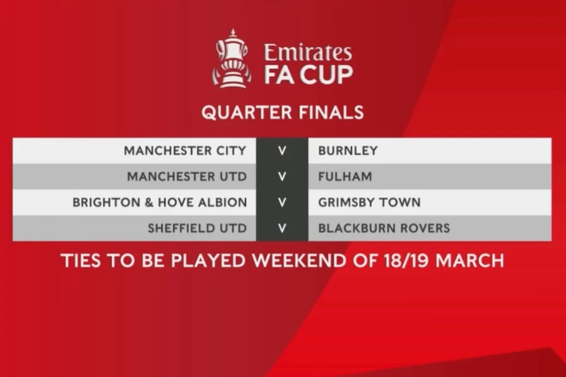สำหรับเกมเอฟเอคัพรอบ 8 ทีมสุดท้าย หรือรอบก่อนรองชนะเลิศ จะทำการแข่งขันกันในช่วงสุดสัปดาห์ของวันที่ 18-19 มี.ค. นี้