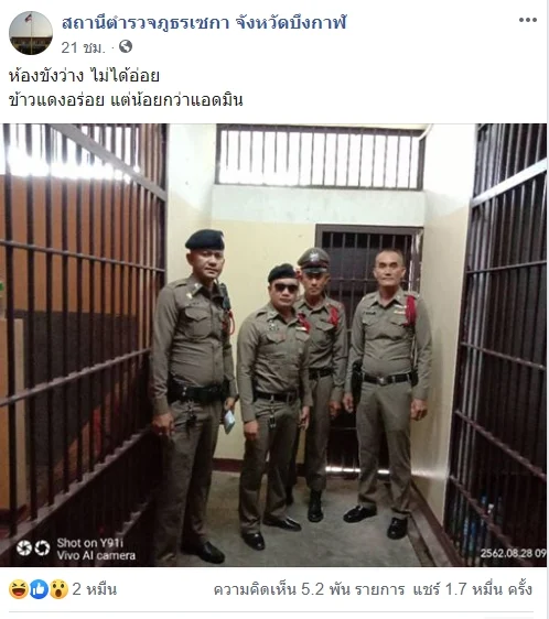เมื่อวันที่ 28 ส.ค.ที่ผ่านมา เพจเฟซบุ๊ก สถานีตำรวจภูธรเซกา จังหวัดบึงกาฬ โพสต์ภาพหน้าห้องขัง พร้อมแคปชั่นว่า “ห้องขังว่าง ไม่ได้อ่อย ข้าวแดงอร่อย แต่น้อยกว่าแอดมิน” และ “สาเหตุที่ถ่ายรูปแล้วเว้นช่องว่าง เพราะอยากให้มีคนข้างๆมาเติมเต็ม”