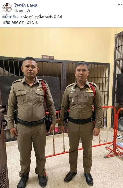 ขณะที่วันเดียวกันนั้น เพจเฟซบุ๊กชื่อ โรงพัก บ่อผุด ของสถานีตำรวจภูธรบ่อผุด จ.สุราษฎร์ธานี ก็ไม่น้อยหน้า ได้โพสต์ภาพและแคปชั่น “#พื้นที่ยังว่าง ห้องข้างๆพึ่งประกันตัวไป พร้อมดูแลท่าน 24 ชม.” โดนใจชาวเน็ตเช่นกันเข้าไปแสดงความเห็นจำนวนมากเช่นกัน