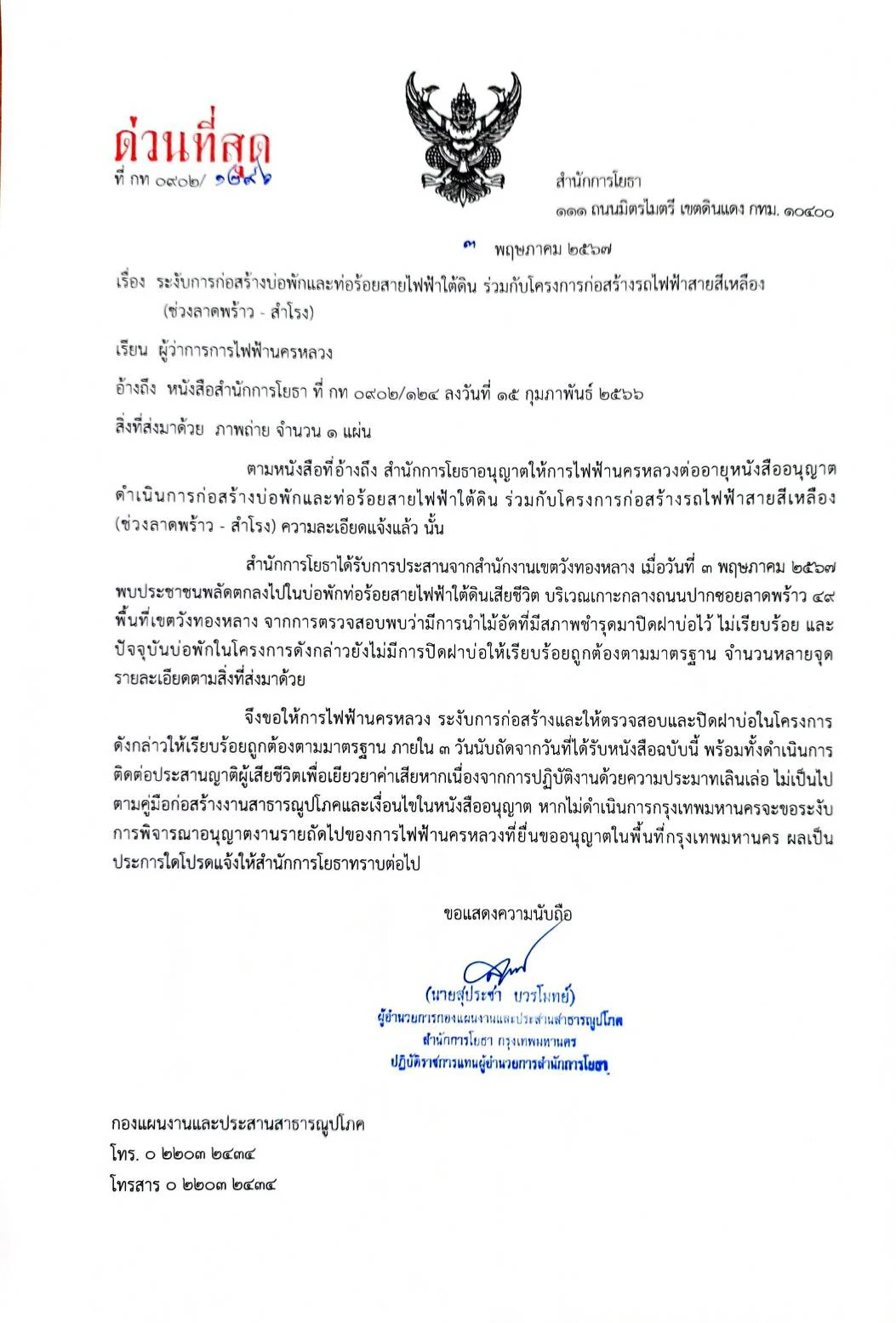 ล่าสุด สำนักการโยธา กรุงเทพมหานคร มีหนังสือด่วนที่สุด ที่ กท. 0902/1296 เรียนถึง ผู้ว่าการไฟฟ้านครหลวง เรื่อง ระงับการก่อสร้างบ่อพักและท่อร้อยสายไฟฟ้าใต้ดิน ร่วมกับโครงการก่อสร้างรถไฟฟ้าสายสีเหลือง(ช่วงลาดพร้าว – สำโรง) ระบุว่า ตามหนังสือที่อ้างถึง สำนักการโยธานุญาตให้การไฟฟ้านครหลวงต่ออายุหนังสือนุญาต ดำเนินการก่อสร้างบ่อพักและท่อร้อยสายไฟฟ้าใต้ดิน ร่วมกับโครงการก่อสร้างรถไฟฟ้าสายสีเหลือง(ช่วงลาดพร้าว – สำโรง) ความละเอียดแจ้งแล้ว นั้น