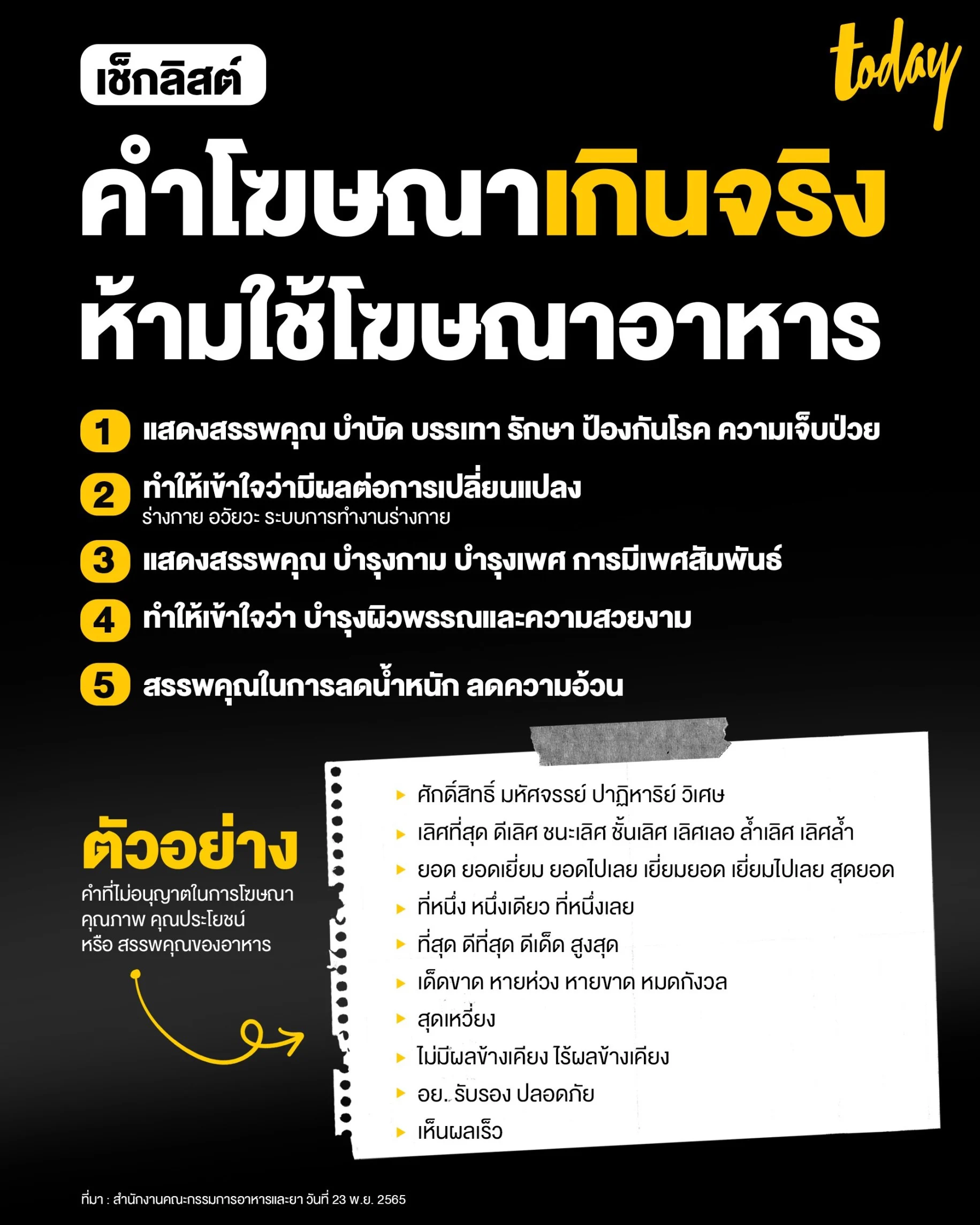 อย. ประกาศแจ้งห้ามใช้คำโฆษณาเกินจริงที่โฆษณาในผลิตภัณฑ์อาหาร ตามหลักเกณฑ์การโฆษณาอาหาร พ.ศ. 2564 ผู้ใดฝ่าฝืนอาจต้องโทษทั้งจำคุกและปรับ และอาจเข้าข่ายความผิดตาม พ.ร.บ.คอมพิวเตอร์