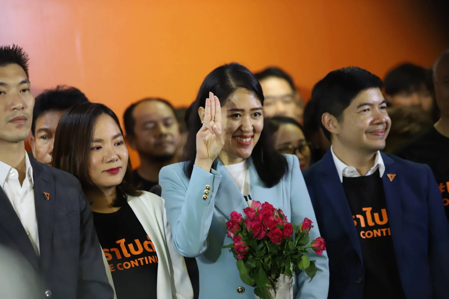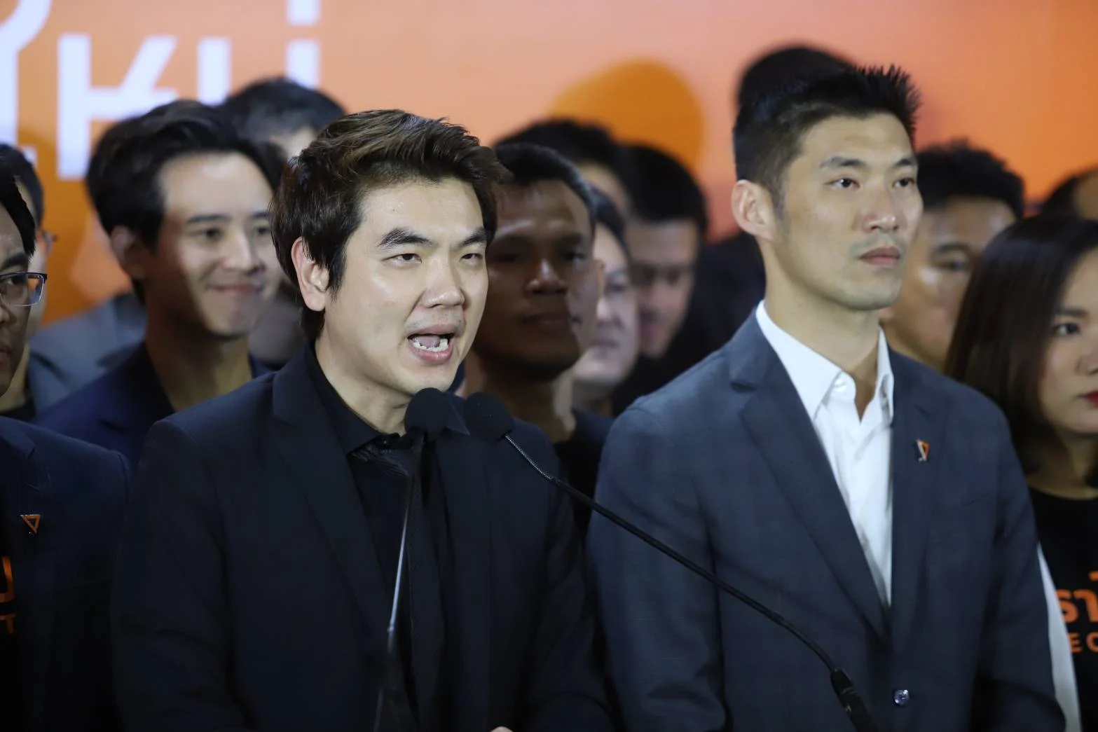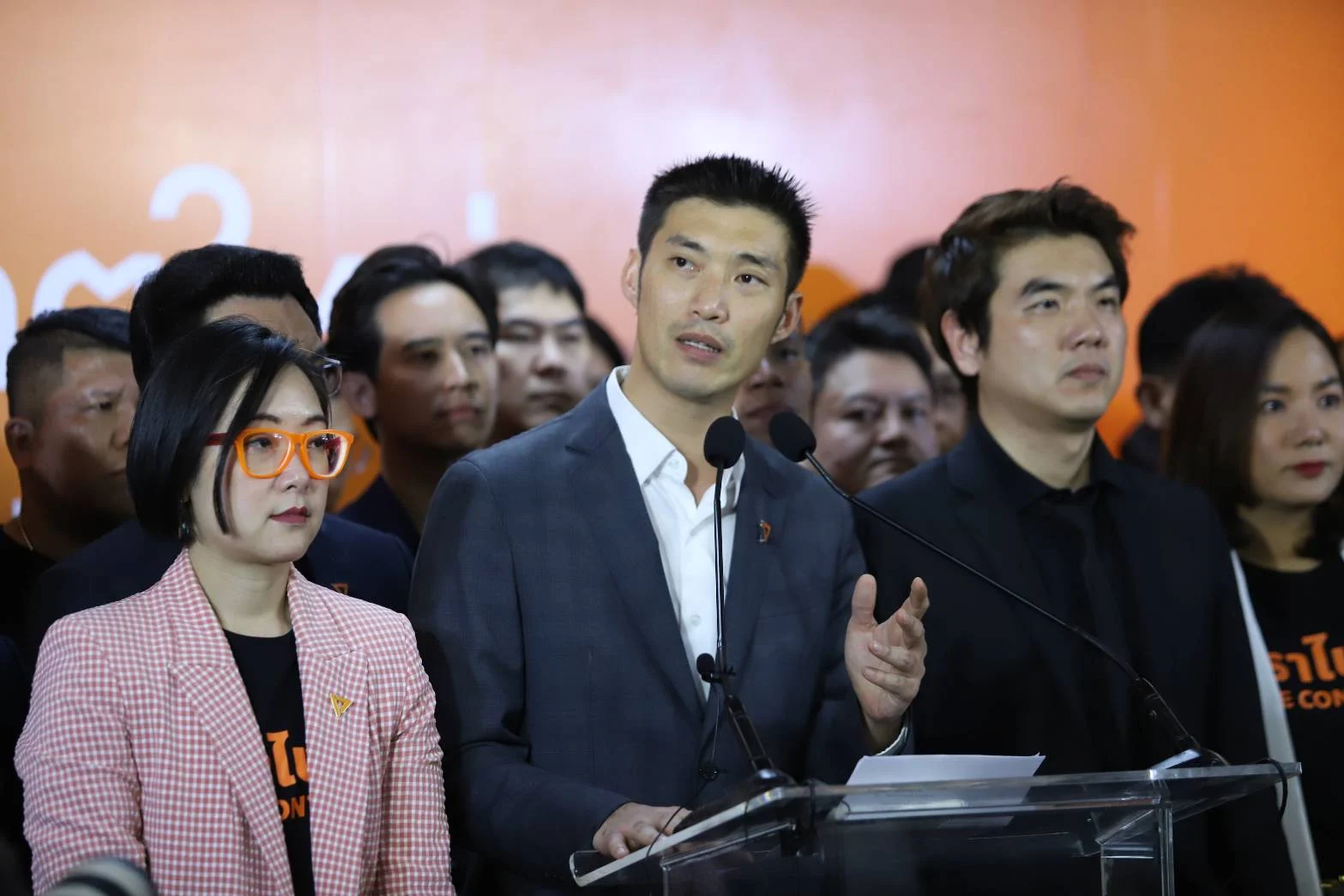 จากนั้นนายธนาธร ได้ปลดเข็มกลัดพรรคจากปกเสื้อสูทออก และเชิญให้ นายทิม พิธา ส.ส.ของพรรคที่ยังอยู่ในสภากล่าวต่อ