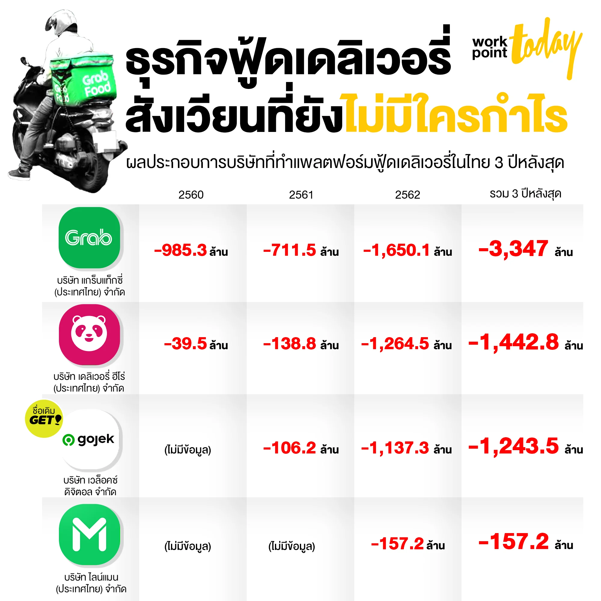 ข้อมูลจากกรมพัฒนาธุรกิจการค้าระบุว่า ตลอด 3 ปีหลังสุด เจ้าของแพลตฟอร์มฟู้ดเดลิเวอรี่ในไทยทั้ง 4 เจ้าหลักล้วนขาดทุนกันถ้วนหน้า เริ่มที่ บริษัท แกร็บแท็กซี่ (ประเทศไทย) จำกัด ซึ่งเป็นเจ้าของแอปพลิเคชั่นแกร็บ (Grab) ที่ทั้งสามารถเรียกรถเพื่อการเดินทาง และสั่งอาหารเดลิเวอรี่ได้ ในช่วง 3 ปีหลังสุด แกร็บแท็กซี่ (ประเทศไทย) ขาดทุนรวมไปทั้งสิ้นกว่า 3,347 ล้านบาท โดยปีที่แล้วขาดทุนมากที่สุด 1650.1 ล้านบาท