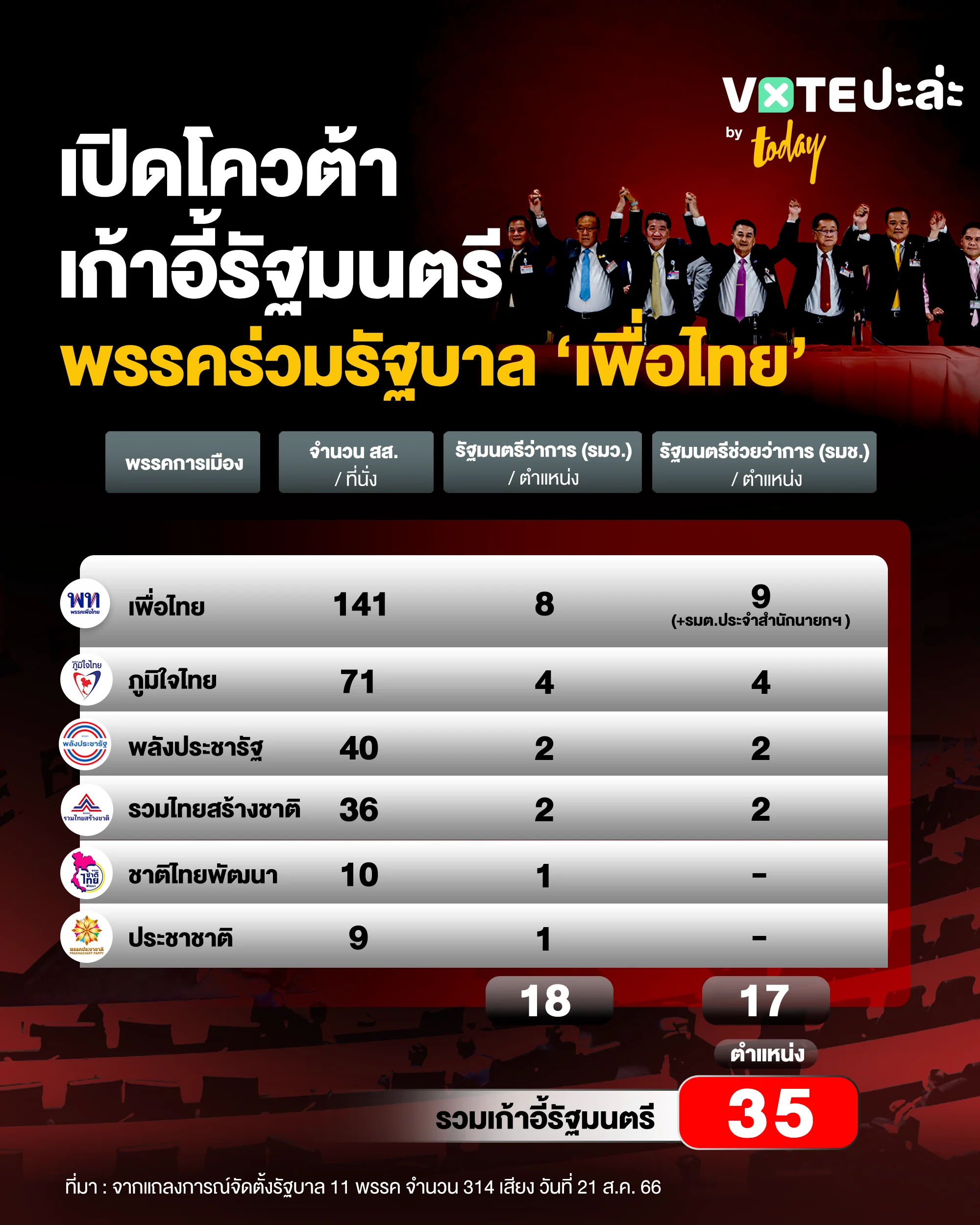 – พรรคเพื่อไทย (141 ที่นั่ง) ทำหน้าที่รัฐมนตรีว่าการ 8 กระทรวง/ รัฐมนตรีช่วย และรัฐมนตรีประจำสำนักนายกรัฐมนตรีรวม 9 ตำแหน่ง