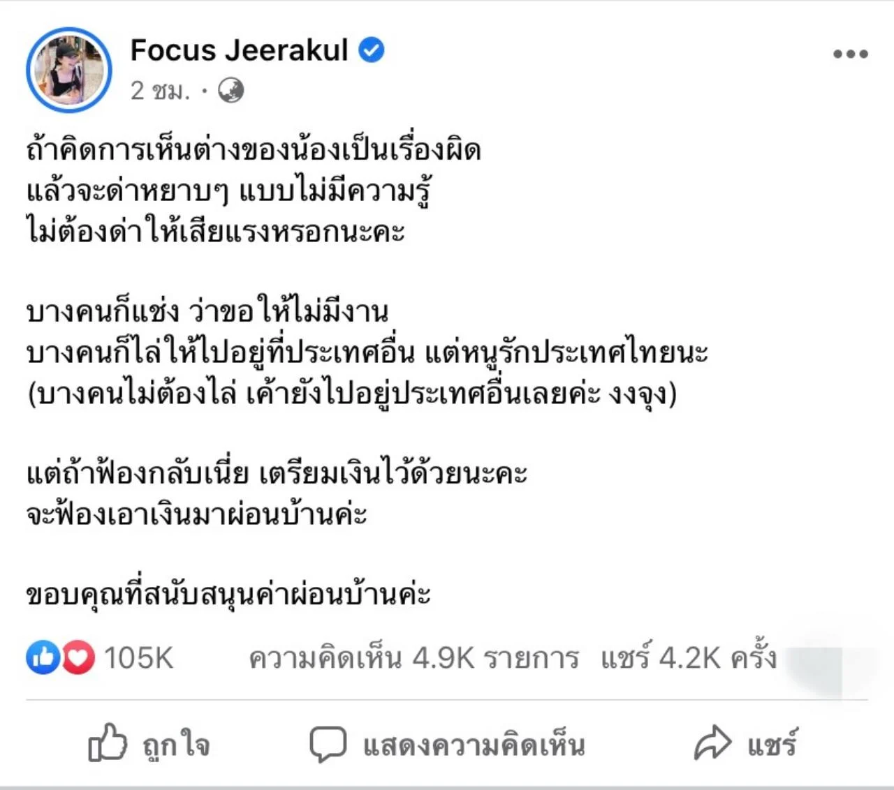 “การเมืองกับคนไทยมันถูกแบ่งแยกกันมาตลอดว่าอย่าไปแตะ ยิ่งเราเป็นคนในวงการบันเทิงเรายิ่งต้องทำตัวเป็นกลางที่สุด มันก็เลยเป็นอย่างนี้มาตลอด แล้ววันนี้การที่มีคนออกมาพูดมันเลยดูเป็นเรื่องใหม่ ซึ่งจริง ๆ แล้วมันควรเป็นเรื่องปกติ”