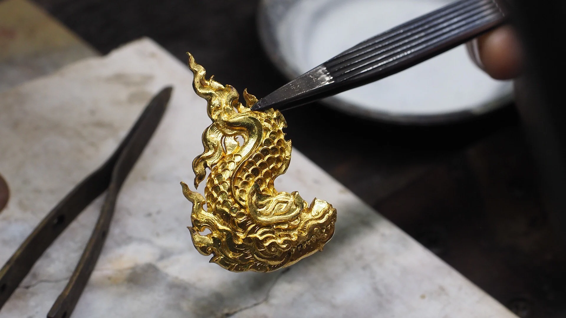 ผลงานชิ้นนี้ถูกสร้างสรรค์ด้วยกรรมวิธีงานทองแบบดั้งเดิมที่สืบทอดจากภูมิปัญญาช่างทองไทย ทั้งเทคนิคการสลักดุน การดัดลวด และการเชื่อมประกอบ รังสรรค์ขึ้นอย่างประณีตและพิถีพิถัน โดยทีมช่างฝีมือจำนวน 5 คน ร่วมกันบรรจงสรรสร้างทุกขั้นตอน เพื่อสะท้อนเจตนารมย์ของ “ทองถนิม” ในการอนุรักษ์และพัฒนาศิลปะเครื่องทองไทยให้คงอยู่เป็นมรดกแห่งความภาคภูมิใจของคนไทยสืบไป