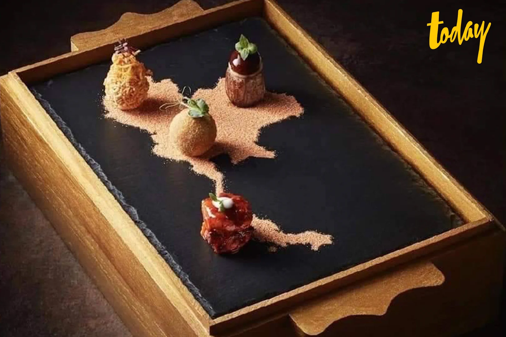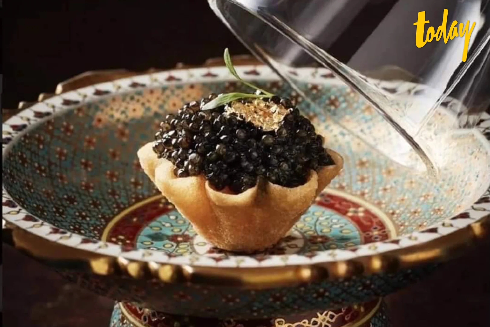 – Amuse-Bouche (ของว่าง) กระทงทองไส้ครีมซอสและไข่ปลาสเตอร์เจียนโครงการหลวงดอยอินทนนท์