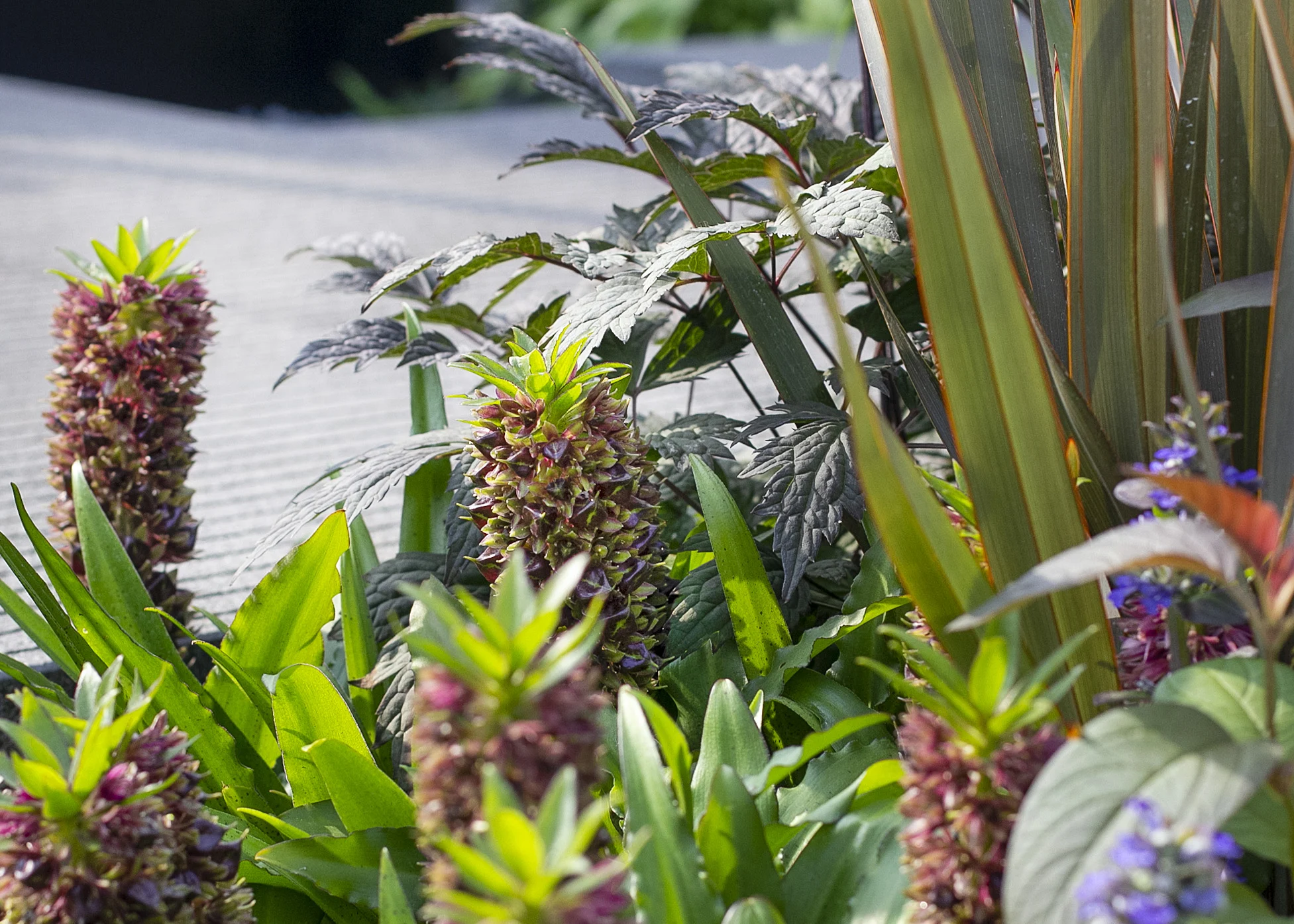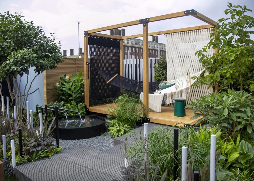 ด้าน คุณพลอยทับทิม สุขแสง สถาปนิกผู้ร่วมออกแบบในทีมกิ่ง ก้าน ใบ อีกท่าน กล่าวว่า จุดเด่นการจัดสวนที่ชนะใจคณะกรรมการในประเทศอังกฤษ เป็นสวนของบ้านในเมืองขนาดกลาง มีขนาดพื้นที่ 36 ตารางเมตร เตรียมต้นไม้ไว้กว่า 1,200 ต้น มีต้นไม้และดอกไม้หลากพันธุ์ มีวัสดุแท่งโลหะ ต่ำๆ แทรกอยู่ด้วย เปรียบเสมือนความไม่เป็นระเบียบและความยุ่งเหยิงของกรุงเทพฯ ทางเดินออกแบบด้วยแผ่นหินแกรนิตเซาะร่องตามยาว นำสายตาเข้ามาสู่ Shelter พื้นที่ศาลาพักผ่อนเป็นตัวแทนของความสุข ความมั่นคงและความสงบที่ซ่อนตัวอยู่ท่ามกลางความวุ่นวาย ระหว่างทางเดินมีต้นไม้ใหญ่ให้ร่มเงา แขวนเปลที่ถักทอด้วยเชือกธรรมชาติจากภูมิปัญญาไทยออกมาเป็นลวดลายและโทนสีโมเดิร์นด้วยฝีมือของคุณยายฉลวย สังขรัตน์ วัย 95 ปี ชุมชนหัตถกรรม อำเภอสองพี่น้อง จังหวัดสุพรรณบุรี