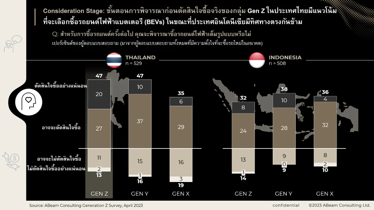 โจนาธาน วาร์กัส รุยซ์ง ผู้อำนวยการฝ่ายอุตสาหกรรมคมนาคม จากเอบีม คอนซัลติ้ง (ประเทศไทย) เปิดเผยว่า ในเดือนเมษายนปี พ.ศ. 2566 เอบีม คอนซัลติ้ง ได้ทำการสำรวจ โดยมีผู้ตอบแบบสำรวจจำนวน 2,200 คนในประเทศอินโดนีเซียและไทย ซึ่งเป็นสองประเทศที่มีตลาดรถยนต์ใหญ่ที่สุดในเอเชียตะวันออกเฉียงใต้