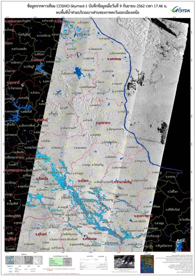 สำนักงานพัฒนาเทคโนโลยีอวกาศและภูมิสารสนเทศ (องค์การมหาชน) หรือ จิสด้า เผยภาพพื้นที่น้ำท่วม (สีฟ้า) จากภาพถ่ายดาวเทียม Cosmo-Skymed-1 ของวันที่ 9 กันยายน 2562 เมื่อเวลา 17:46 น. ในบริเวณบางส่วนของภาคตะวันออกเฉียงเหนือ รวมเนื้อที่ได้ความเสียประมาณ 827,270 ไร่