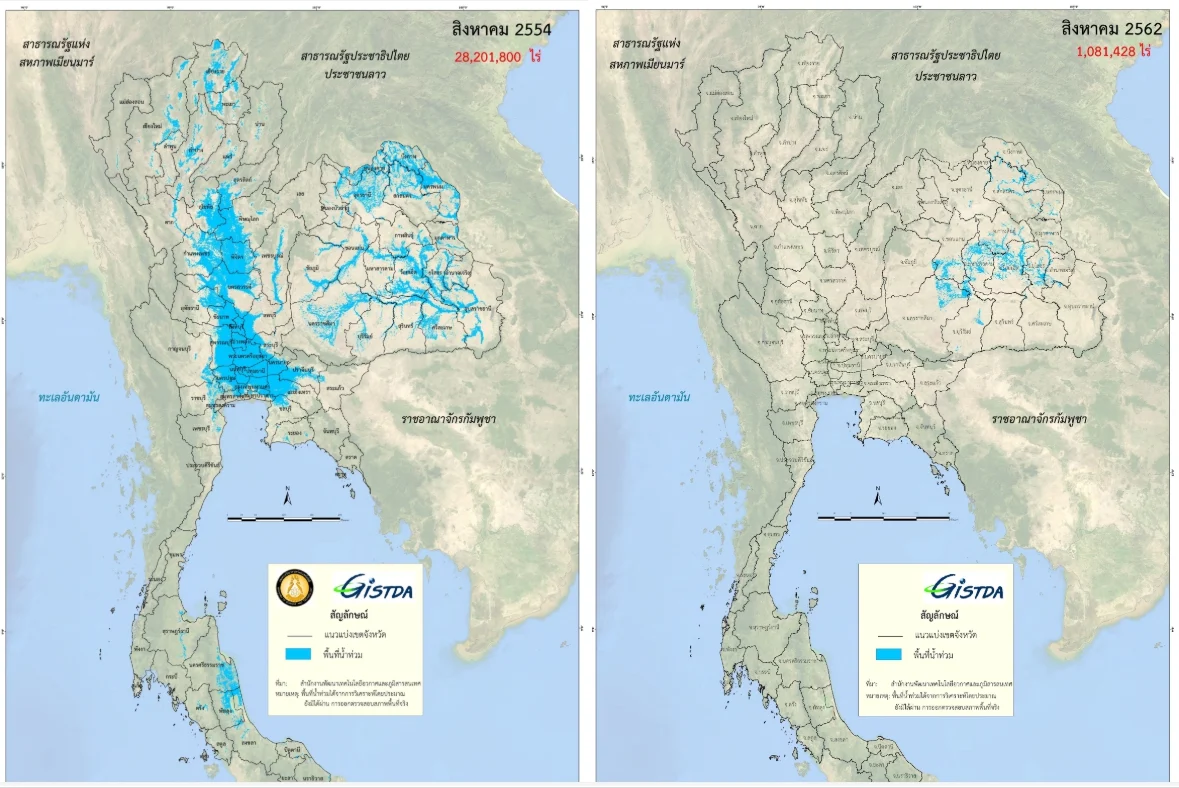 ขณะเดียวกัน จิสด้าได้มีการเผยแพร่ภาพสถานการณ์น้ำท่วมเปรียบเทียบ ปี54-62 โดยพบว่าเหตุการณ์น้ำท่วมใหญ่ เมื่อปี 2554 ในเดือนสิงหาคม มีพื้นที่ได้รับผลกระทบ 28,201,800 ไร่ ขณะที่ปี 2562 ในเดือนสิงหาคม มีพื้นที่น้ำท่วม 1,081,428 ไร่