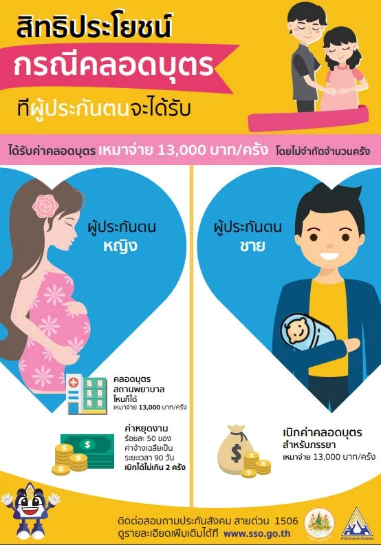 ประกันสังคม เผยสิทธิฝ่ายหญิง ได้เงินค่าคลอดเหมาจ่ายครั้งละ 13,000 บาท เงินชดเชยหยุดงาน 50 % ของเงินเดือนเป็นเวลา 90 วัน ขณะที่ ฝ่ายชาย ได้รับเฉพาะเงินค่าคลอดบุตร 13,000 บาท ไม่ว่าจะมีทะเบียนสมรสหรือไม่