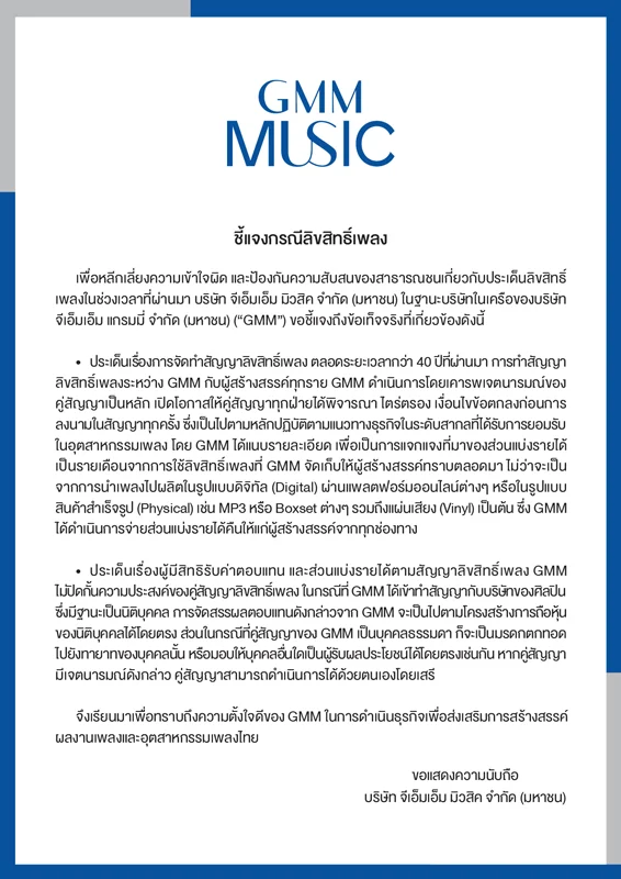 เพื่อหลีกเลี่ยงความเข้าใจผิด และป้องกันความสับสนของสาธารณชนเกี่ยวกับประเด็นลิขสิทธิ์เพลง ในช่วงเวลาที่ผ่านมา บริษัท จีเอ็มเอ็ม มิวสิค จำกัด (มหาชน) ในฐานะบริษัทในเครือของบริษัท จีเอ็มเอ็ม แกรมมี่ จำกัด (มหาชน) (“GMM”) ขอชี้แจงถึงข้อเท็จจริงที่เกี่ยวข้องดังนี้