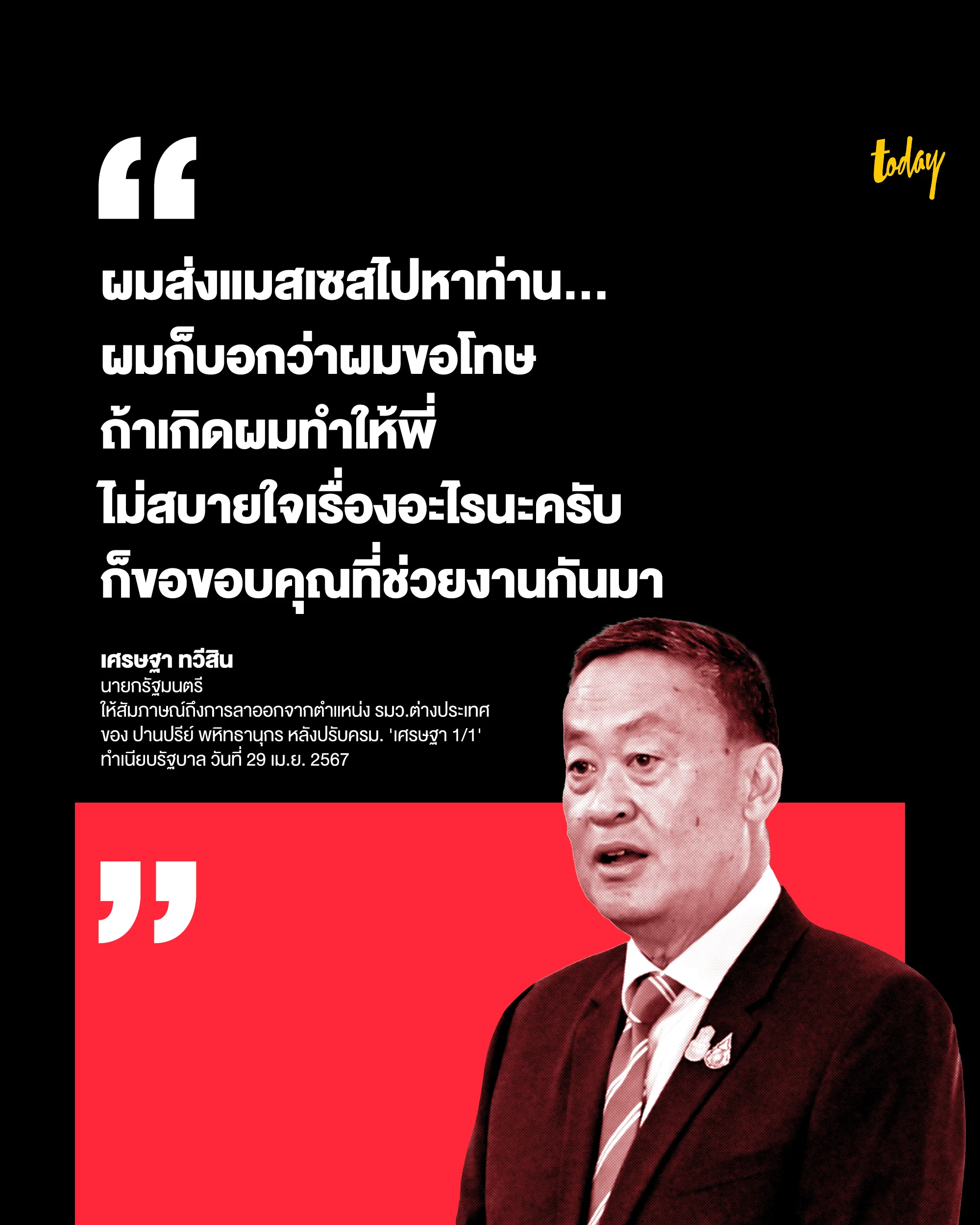 นายเศรษฐา ยอมรับว่า ได้ส่งข้อความถึงนายปานปรีย์ ในกลุ่มงานที่เกี่ยวกับต่างประเทศ โดยได้ขอโทษหากทำให้ไม่สบายใจในเรื่องใดๆ และขอบคุณที่ช่วยงานกันมา ซึ่งการปรับคณะรัฐมนตรี ได้มีการแจ้งและเชิญรัฐมนตรีมาพูดคุยกัน ซึ่งนายปานปรีย์ก็เป็นหนึ่งในนั้นที่ได้เชิญมาพูดคุย และขอไม่เปิดเผยเพราะเป็นการพูดคุยกันระหว่างบุคคล 2 คน