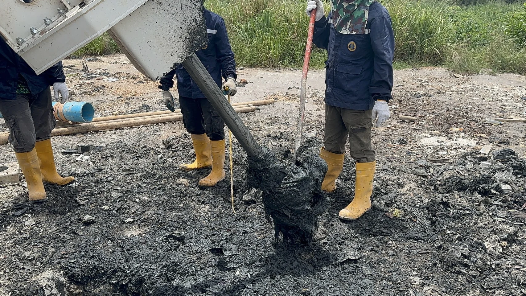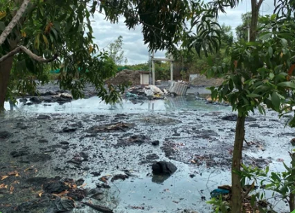 ทว่า เมื่อเครื่องขุดเจาะน้ำบาดาลเดินเครื่อง เจาะลึกลงไปใต้ผืนดินประมาณ 3 เมตร ของเหลวหนืดข้นสีดำก็พวยพุ่งขึ้นมา บ่งบอกให้รู้ว่ามีกากอุตสาหกรรมถูกฝังกลบอยู่เบื้องล่าง