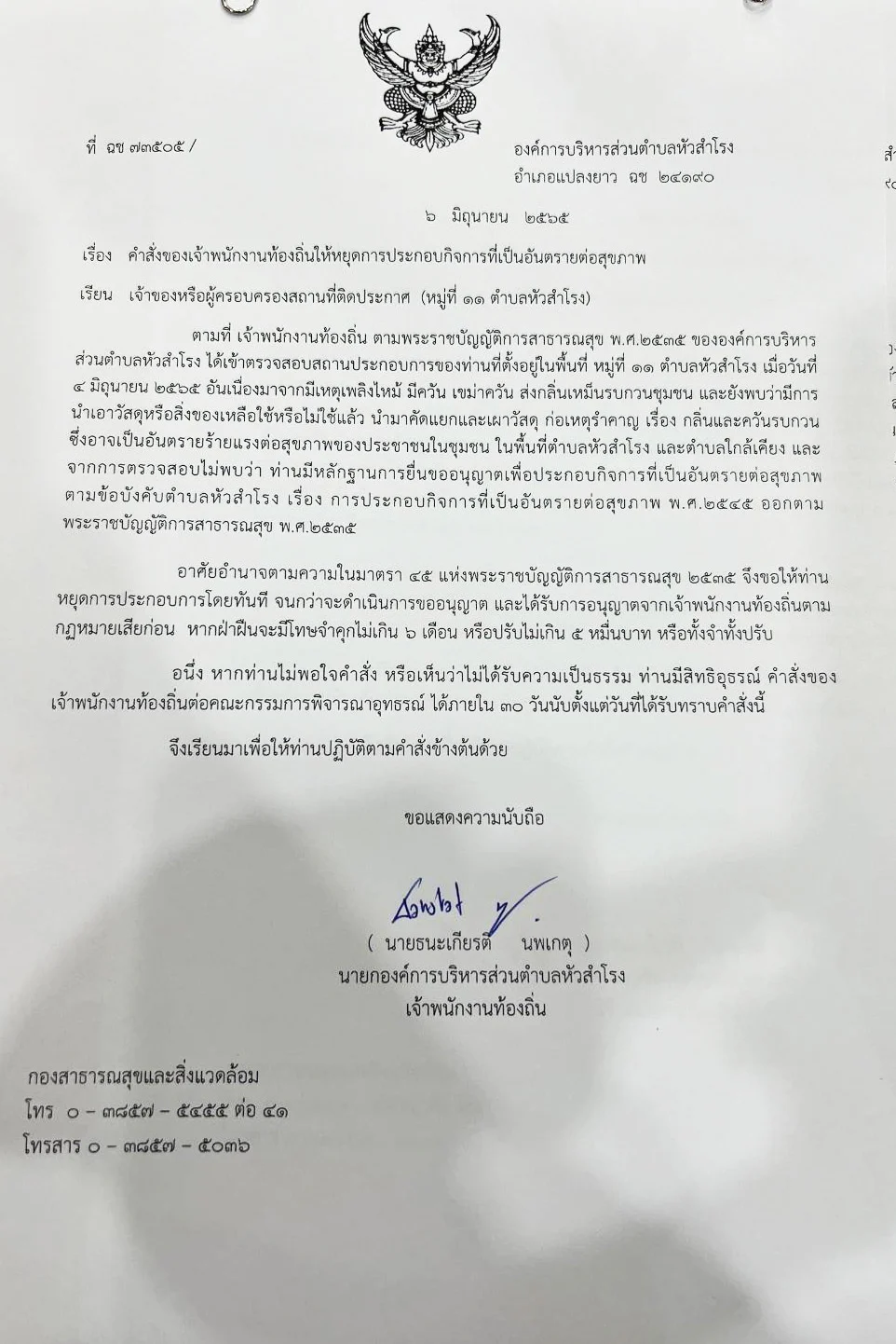 จากเหตุการณ์นั้น ในวันที่ 4 มิถุนายน 2565 องค์การบริหารส่วนตำบลหัวสำโรง เข้าไปตรวจสอบ เป็นที่มาของ ‘คำสั่งของเจ้าพนักงานท้องถิ่นให้หยุดการประกอบกิจการที่เป็นอันตรายต่อสุขภาพ’ ด้วยเหตุว่า ที่ดินแห่งนี้ ถึงแม้จะปรากฏพบการนำวัสดุมาคัดแยก และเผา พูดง่ายๆ ว่ามีการดำเนินกิจการด้านของเสีย โดยมีการปลูกสร้างอาคารให้เห็นอย่างเด่นชัด