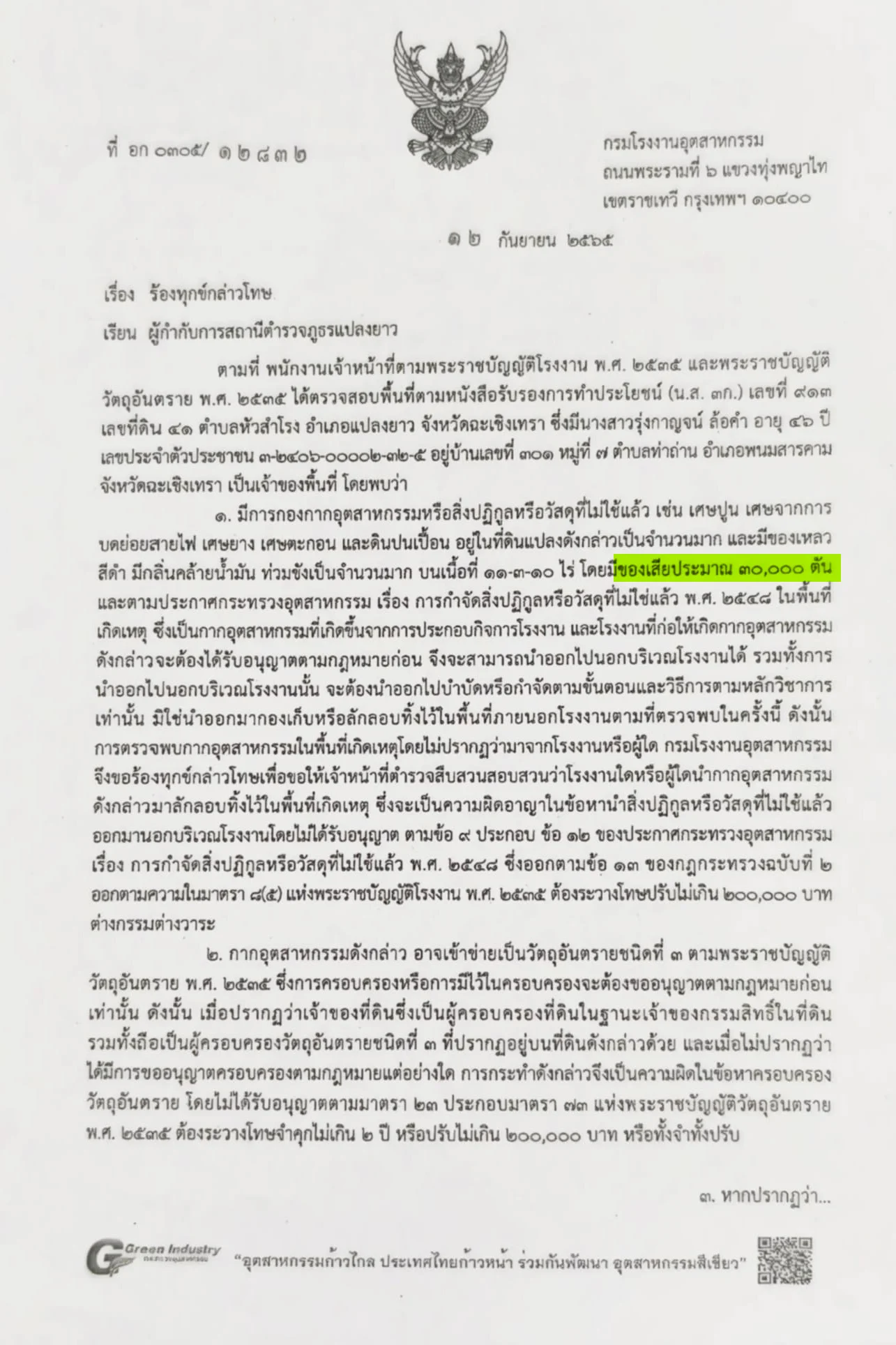 ด้วยเหตุว่า ในหนังสือ ‘ร้องทุกข์กล่าวโทษ’ หรือเอกสารประกอบการแจ้งความ ของเจ้าหน้าที่กรมโรงงานอุตสาหกรรม และอุตสาหกรรมจังหวัดฉะเชิงเทรา ลงวันที่ 12 กันยายน 2565 ได้ระบุว่า‘ เจ้าของที่ดินต้องนำกองกากอุตสาหกรรม หรือ สิ่งปฏิกูล หรือ วัสดุที่ไม่ใช้แล้ว เช่น เศษปูน เศษจากการบดย่อยสายไฟ เศษยาง เศษตะกอน และดินปนเปื้อน…และของเหลวสีดำ มีกลิ่นคล้ายน้ำมันท่วมขัง เป็นจำนวนมาก บนเนื้อที่ 11 ไร่ โดยมีของเสียประมาณ 30,000 ตัน ไปบำบัดกำจัดให้เรียบร้อย’