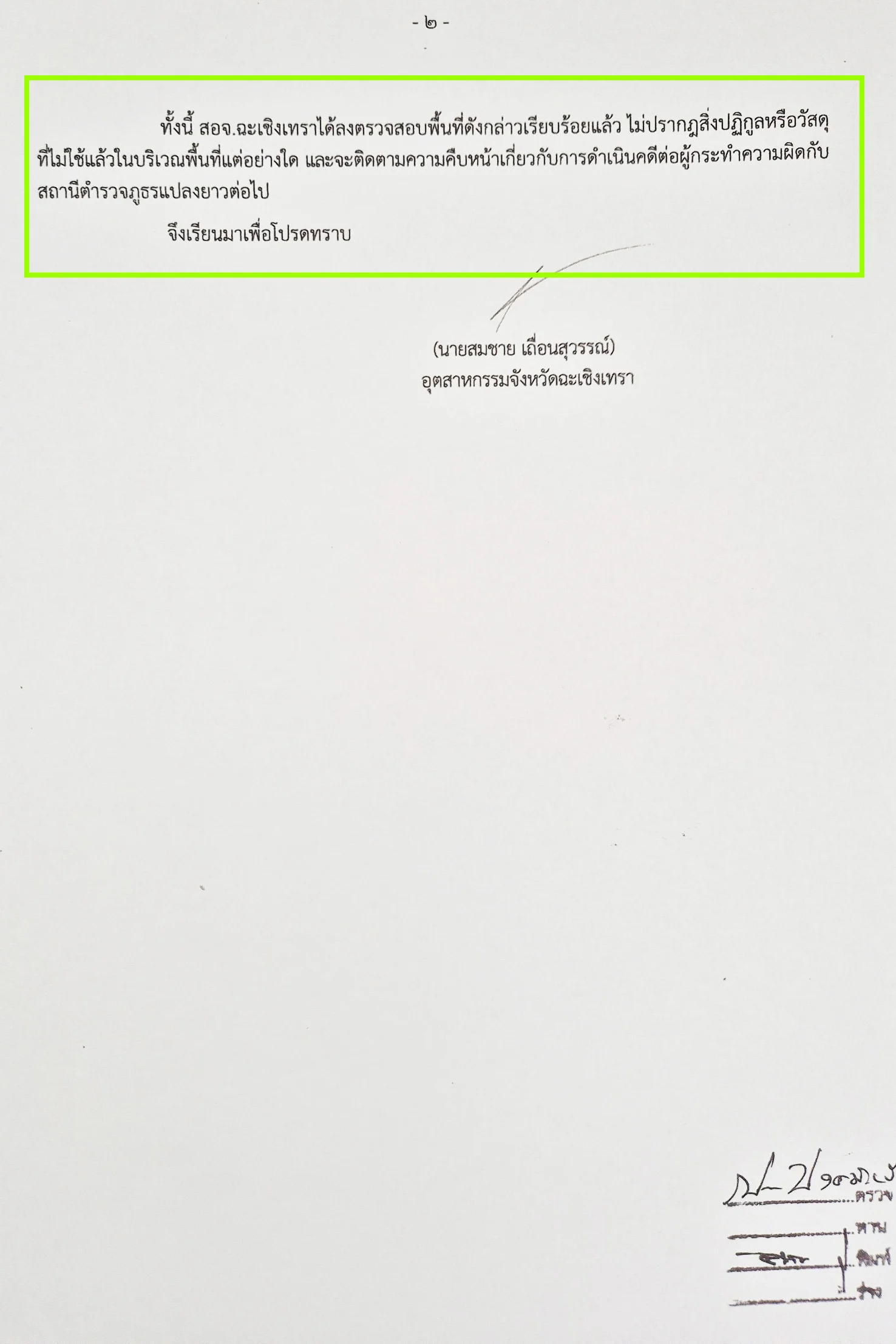 “ทั้งนี้ สอจ. ฉะเชิงเทราได้ลงตรวจสอบพื้นที่ดังกล่าวเรียบร้อยแล้ว ไม่ปรากฏสิ่งปฏิกูล หรือ วัสดุที่ไม่ใช้แล้วในบริเวณพื้นที่แต่อย่างใด และจะติดตามความคืบหน้าเกี่ยวกับการดำเนินคดีต่อผู้กระทำความผิดกับสถานีตำรวจภูธรแปลงยาวต่อไป” ชื่อหลังข้อความ ‘จึงเรียนมาเพื่อทราบ’ คือ สมชาย เถื่อนสุวรรณ์ อุตสาหกรรมจังหวัดฉะเชิงเทรา