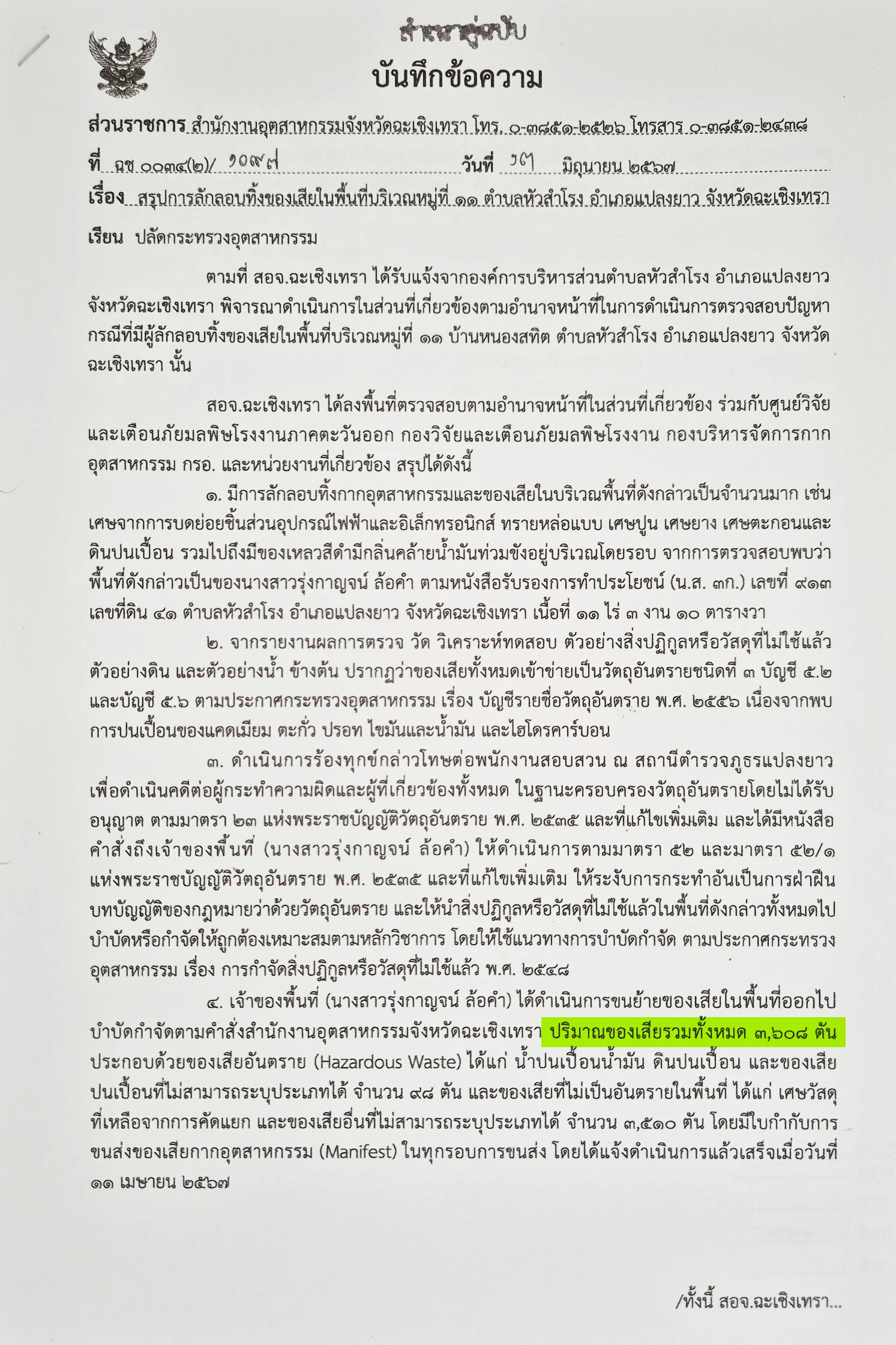 อย่างไรก็ดี จากข้อมูลในเอกสารสรุปผล การกำจัดกากอุตสาหกรรมที่สำนักงานอุตสาหกรรมจังหวัดฉะเชิงเทรา ส่งไปรายงานต่อปลัดกระทรวงอุตสาหกรรม ลงวันที่ 13 มิถุนายน 2567 กลับระบุปริมาณของเสียรวมทั้งหมดที่เจ้าของพื้นที่ ขนย้ายออกไปบำบัดกำจัดตามคำสั่งว่า มีเพียง 3,608 ตัน