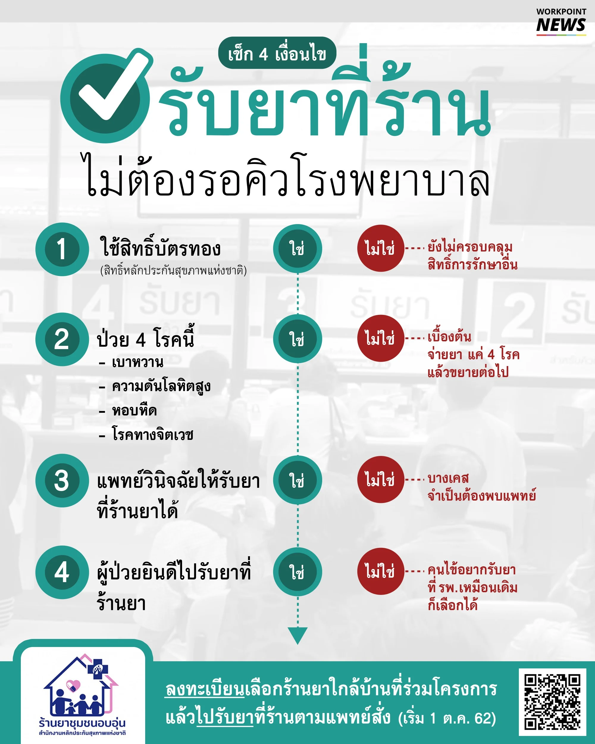 ในระยะแรกสำนักงานหลักประกันสุขภาพแห่งชาติ หรือ สปสช. สนับสนุนงบประมาณให้ผู้ป่วยที่ใช้ “สิทธิบัตรหลักประกันสุขภาพถ้วนหน้า” หรือ “บัตรทอง” เฉพาะ 4 กลุ่มโรค ได้แก่ 1.โรคเบาหวาน 2.โรคความดันโลหิตสูง 3. โรคหอบหืด 4.โรคทางจิตเวช สามารถเลือกขอรับยาที่ร้านยาใกล้บ้านที่มีเภสัชกรประจำอย่างน้อย 8 ชั่วโมง และเข้าร่วมโครงการนี้กับโรงพยาบาล