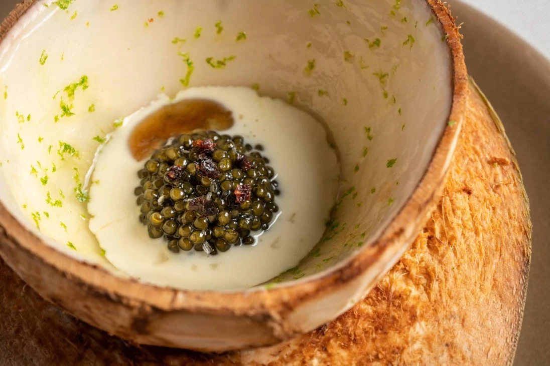เริ่มด้วยจานแรกอย่างน้ำเต้าที่นำไปสโมค จนเกิดรสชาติแปลกใหม่ชวนให้ประหลาดใจตั้งแต่คำแรกที่ได้จิบ ต่อด้วย Coconut & Smoked Caviar คาเวียร์จากหัวหิน กินกับมะพร้าวเนื้ออ่อน ๆ เข้ากันดีกับแชมเปญ Rupture Marie Copinet, Blanc De Noir Champange ตามด้วย Sea Snail ฝานมาบาง ๆ บนบิสกิต ให้รสชาติสดชื่น