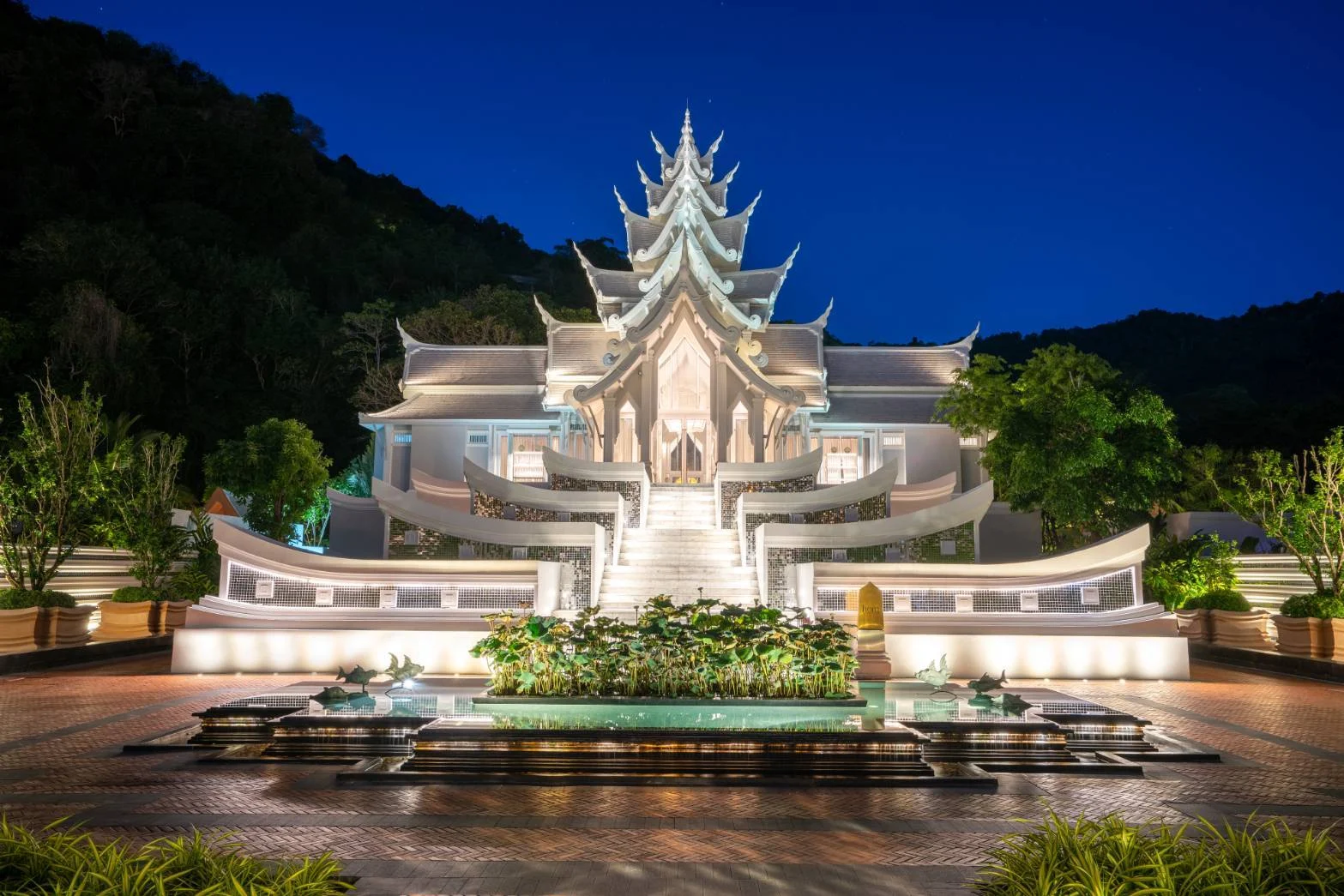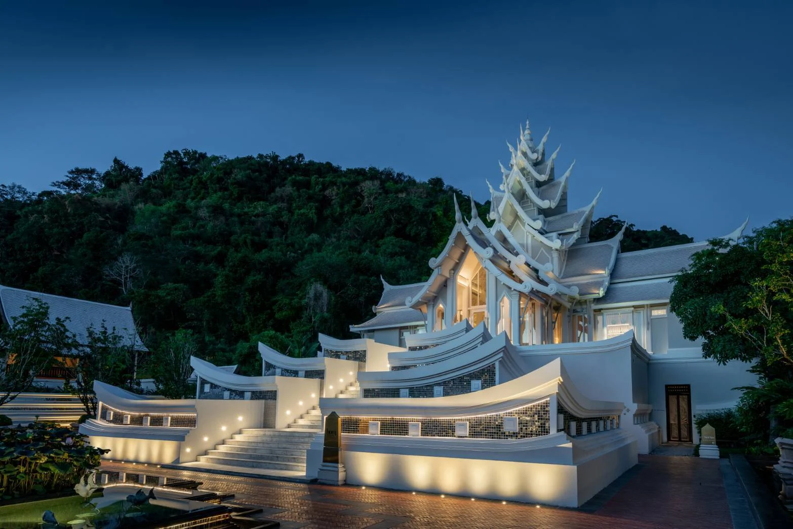 ทันทีที่เดินผ่านลอบบี้ของโรงแรม InterContinental Phuket Resort เราก็จะได้พบความสวยสง่าของ Sawan Pavillion ที่อยู่ตรงปลายทางของทางเดินที่ล้อมด้วยกำแพงประดับกระจก ซึ่งโอบล้อมด้วยภูเขา โดยทีมงานจะนำแขกเดินและเล่าเรื่องราวของสถานที่ไปจนถึงร้าน ผ่านเมฆหมอกที่ให้ความรู้สึกเหมือนเดินผ่านสวรรค์และดินแดนหิมพานต์ที่เป็นแรงบันดาลใจของการออกแบบอาคาร