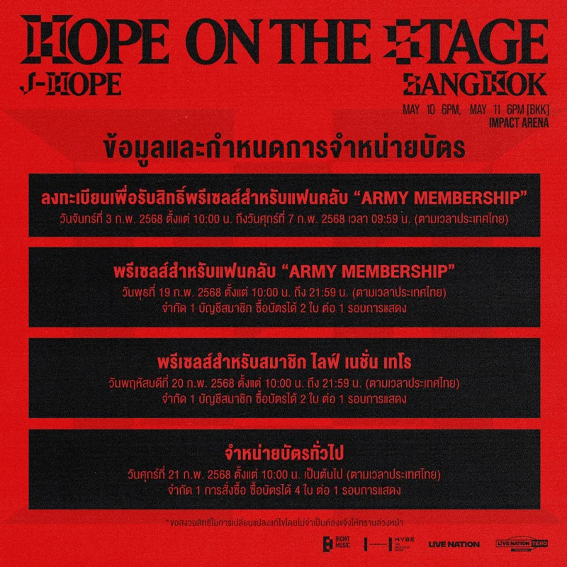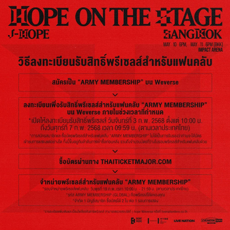- พรีเซลส์สำหรับสมาชิกไลฟ์ เนชั่น เทโร วันที่ 20 ก.พ. (10:00 – 21:59 น.) ที่ https://bit.ly/ps-j-hope-bkk2025 เท่านั้น สมัครสมาชิกฟรี!